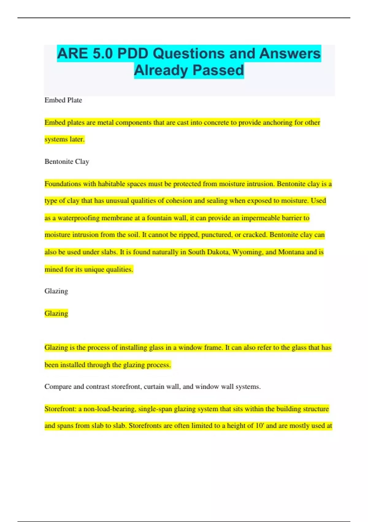 ARE 5.0 PDD Questions and Answers Already Passed Embed Plate Embed plates are metal components that are cast into concrete to provide anchoring for other systems later. Bentonite Clay Foundations with habitable spaces must be protected from moisture intrusion. Bentonite clay is a type of clay that has unusual qualities of cohesion and sealing when exposed to moisture. Used as a waterproofing membrane at a fountain wall, it can provide an impermeable barrier to moisture intrusion from the soil. It cannot be ripped, punctured, or cracked. Bentonite clay can also be used under slabs. It is found naturally in South Dakota, Wyoming, and Montana and is mined for its unique qualities. Glazing Glazing Glazing is the process of installing glass in a window frame. It can also refer to the glass that has been installed through the glazing process. Compare and contrast storefront, curtain wall, and window wall systems. Storefront: a non-load-bearing, single-span glazing system that sits within the building structure and spans from slab to slab. Storefronts are often limited to a height of 10' and are mostly used at the ground floor, but they can be placed at the upper levels of low-rise buildings. Curtain wall: Non-load-bearing glazing system that "hangs" outside of the building structure and can span up to 20' (or even further with reinforcement). Curtain walls are appropriate for use in the higher floors of tall buildings, and because curtain walls often hang outside of the building structure, they can span between floors. Window wall: a non-load-bearing glazing system that spans from slab to slab, similar to storefronts. Unlike storefronts, window wall systems are rated for use in upper floors and can provide a look similar to curtain walls at a lower cost. Weathering Steel Also called corten. Weathering steel is a steel alloy that is designed to form a protective oxide coating as it weathers. Cor-ten stands for corrosion and tension. Ice Damming When warm air rises out of a heated space into an unheated roof and there is snow on the roof, the heat melts the snow and the water runs down the roof to the eave and gutter, where it cools and turns to ice, forming a dam where more water collects and leaks into the walls and ceilings of the building. Areas most susceptible to ice damming include roof eaves and valleys. USCPSC USCPSC The United States Consumer Product Safety Commission is an independent federal agency that serves to protect the public from products that may be unsafe due to risk of fire, mechanical failure, chemical exposure, or electrical malfunction. Float Glass A sheet of glass made by pouring molten glass onto a sheet of molten metal, usually tin. Also called annealed glass. Float glass is very smooth and free from distortions. Laminated Glass A type of safety glass consisting of two or more pieces of glass with layers of polyvinyl butyral resin sheet interlayers. It is good for security because the plastic interlayer holds the glass together instead of shattering. Laminated glass is also a better sound protector than regular glass, due to the inner layer. Spandrel Glass Spandrel Glass Spandrel glass is glass that is designed to be opaque and is used where vision glass is not desired, such as in a building curtain wall façade, where the glass will need to cover the features of the building at the floor and ceiling or columns. Low-E Glass Low-E or low-emissivity glass has an extremely thin (a few atoms' width) layer of metal on the surface that selectively reflects and transmits certain wavelengths of the electromagnetic spectrum. Long wave heat radiation is not transmitted but visible light is reflected. Low-E glass is often used in insulated glass units. Reflective Glass Reflective glass is coated with a very thin layer of metal with the primary purpose of reflecting radiative heat. Tempered Glass Glass that is heated to a high temperature (about 1200º F) and then quickly cooled. The heating and cooling process creates compressive stresses on the outer surfaces and tensile stresses on the inside. It is about four times stronger than float glass of the same thickness. When breaking, tempered glass shatters into many tiny pieces instead of dangerous shards. Tempered glass cannot be cut, so it must be formed in the desired size