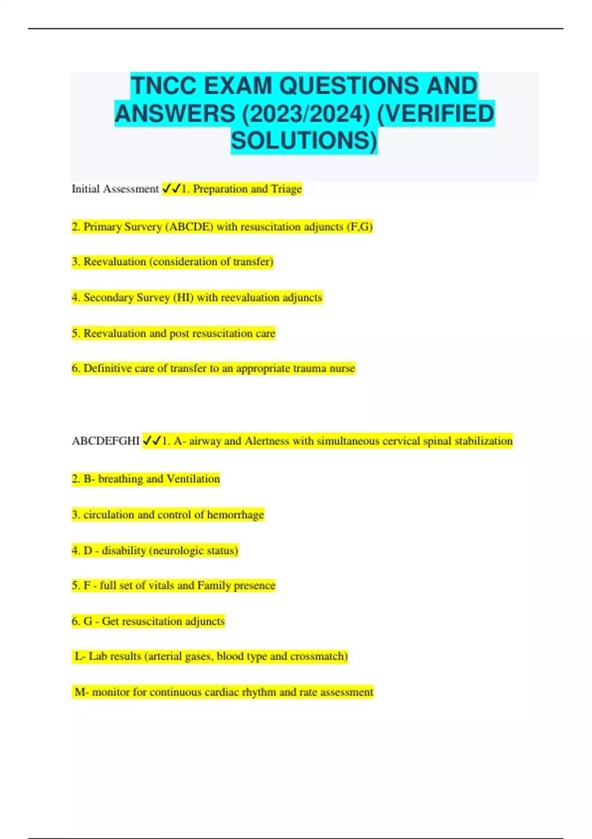 Initial Assessment 1. Preparation and Triage 2. Primary Survery (ABCDE) with resuscitation adjuncts (F,G) 3. Reevaluation (consideration of transfer) 4. Secondary Survey (HI) with reevaluation adjuncts 5. Reevaluation and post resuscitation care 6. Definitive care of transfer to an appropriate trauma nurse ABCDEFGHI 1. A- airway and Alertness with simultaneous cervical spinal stabilization 2. B- breathing and Ventilation 3. circulation and control of hemorrhage 4. D - disability (neurologic status) 5. F - full set of vitals and Family presence 6. G - Get resuscitation adjuncts L- Lab results (arterial gases, blood type and crossmatch) M- monitor for continuous cardiac rhythm and rate assessment TNCC EXAM QUESTIONS AND ANSWERS (2023/2024) (VERIFIED SOLUTIONS)N- naso or orogastric tube consideration O- oxygenation and ventilation analysis: Pulse oxygemetry and end-tidal caron dioxide (ETC02) monitoring and capnopgraphy H- History and head to toe assessment I- Inspect posterior surfaces
