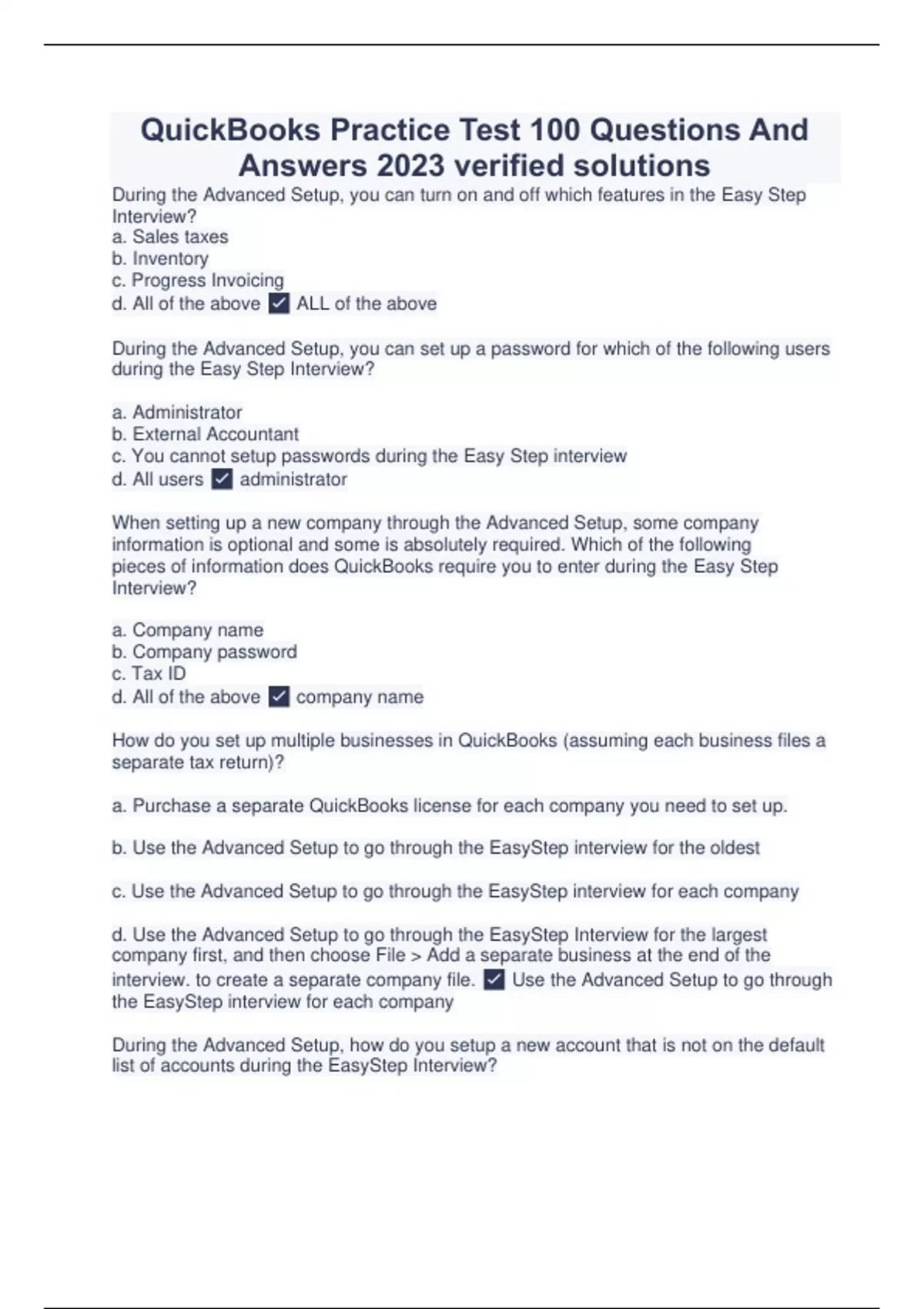 Quick Books Certification Exam Study Guide | Verified Questions And Answers Quick Books Certification Exam Study Guide | Verified Questions And Answers