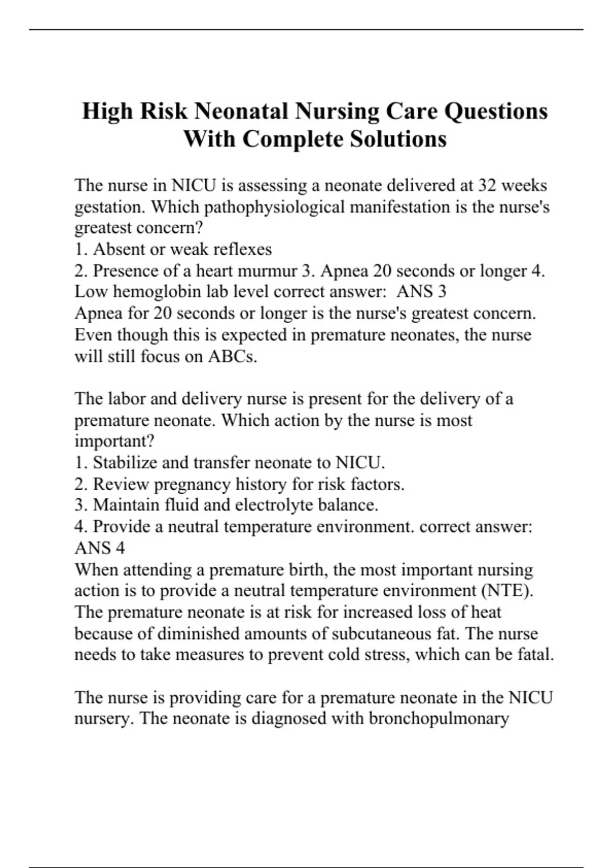 High Risk Neonatal Nursing Care Questions With Complete Solutions