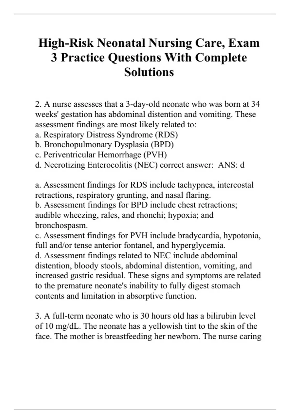 High-Risk Neonatal Nursing Care, Exam 3 Practice Questions With Complete Solutions