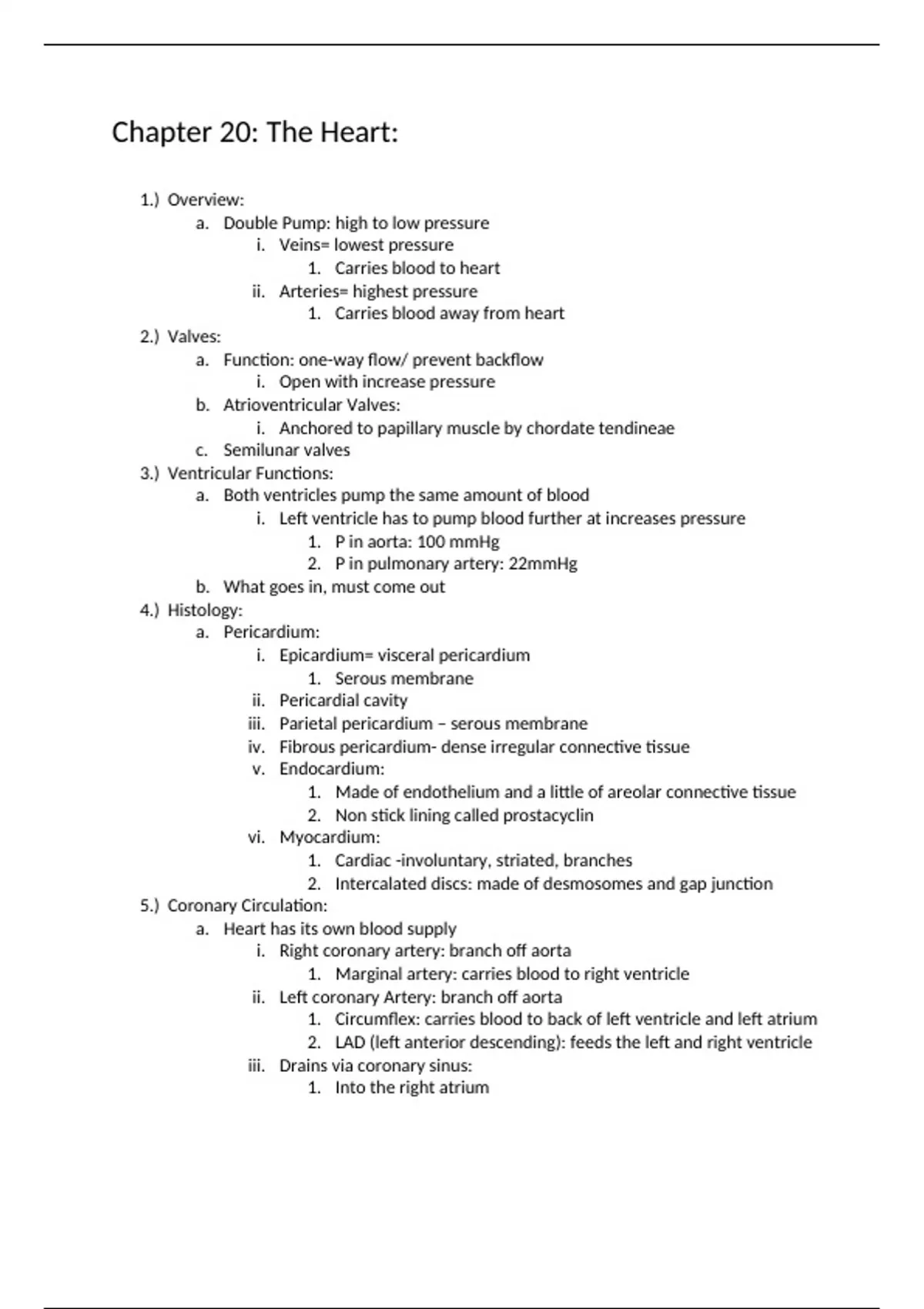 Very in depth class notes about the heart chapter in anatomy and physiology. explains the heart valves and more