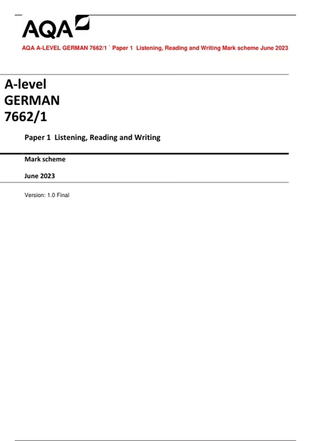 AQA A-LEVEL GERMAN 7662/1 ` Paper 1 Listening, Reading and Writing Mark scheme June 2023