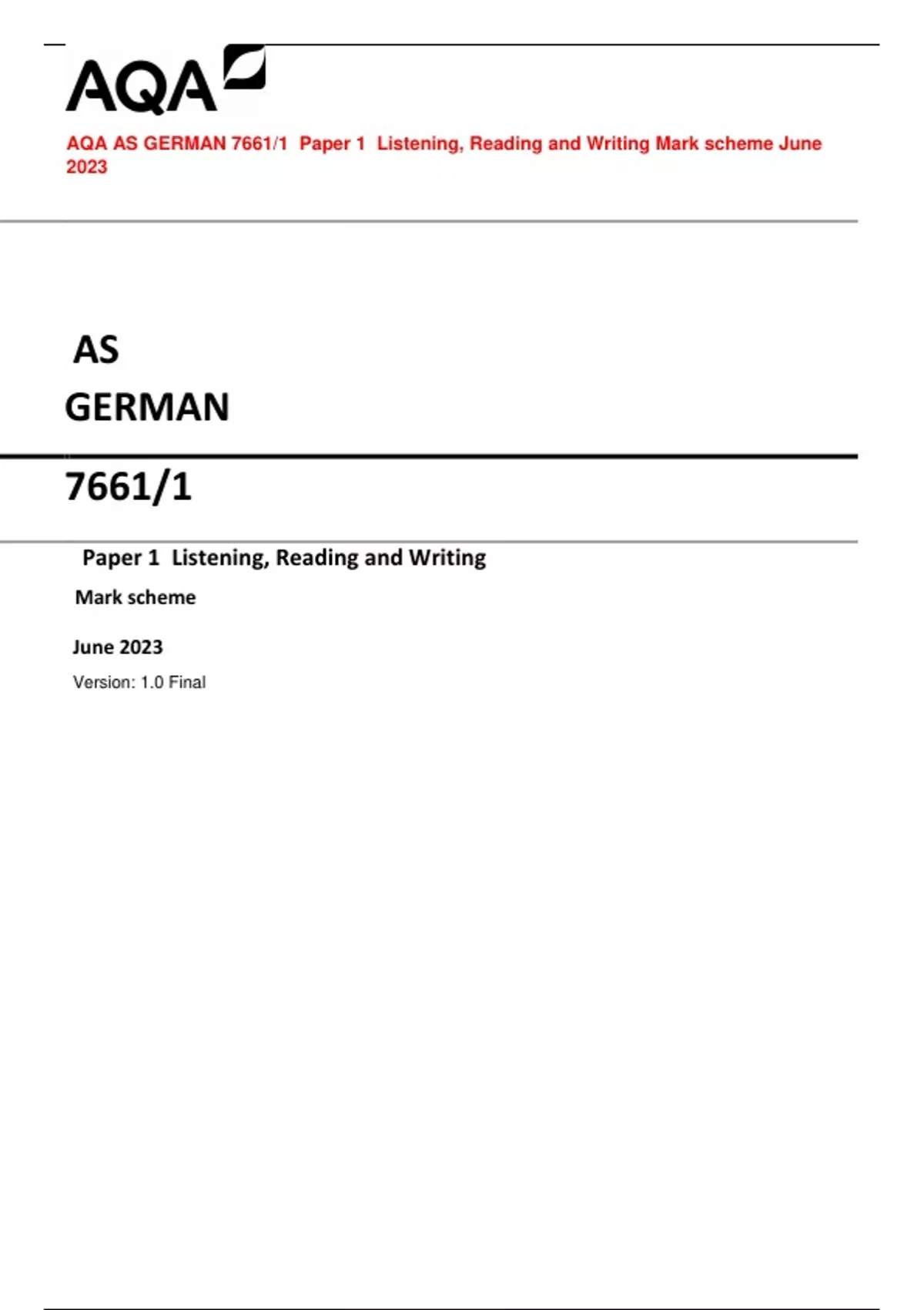 AQA AS GERMAN 7661/1 Paper 1 Listening, Reading and Writing Mark scheme June 2023