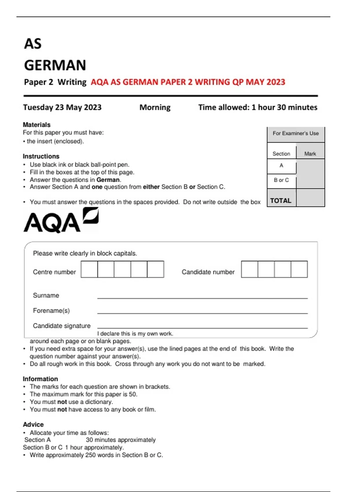 AQA AS GERMAN PAPER 2 WRITING QP MAY 2023