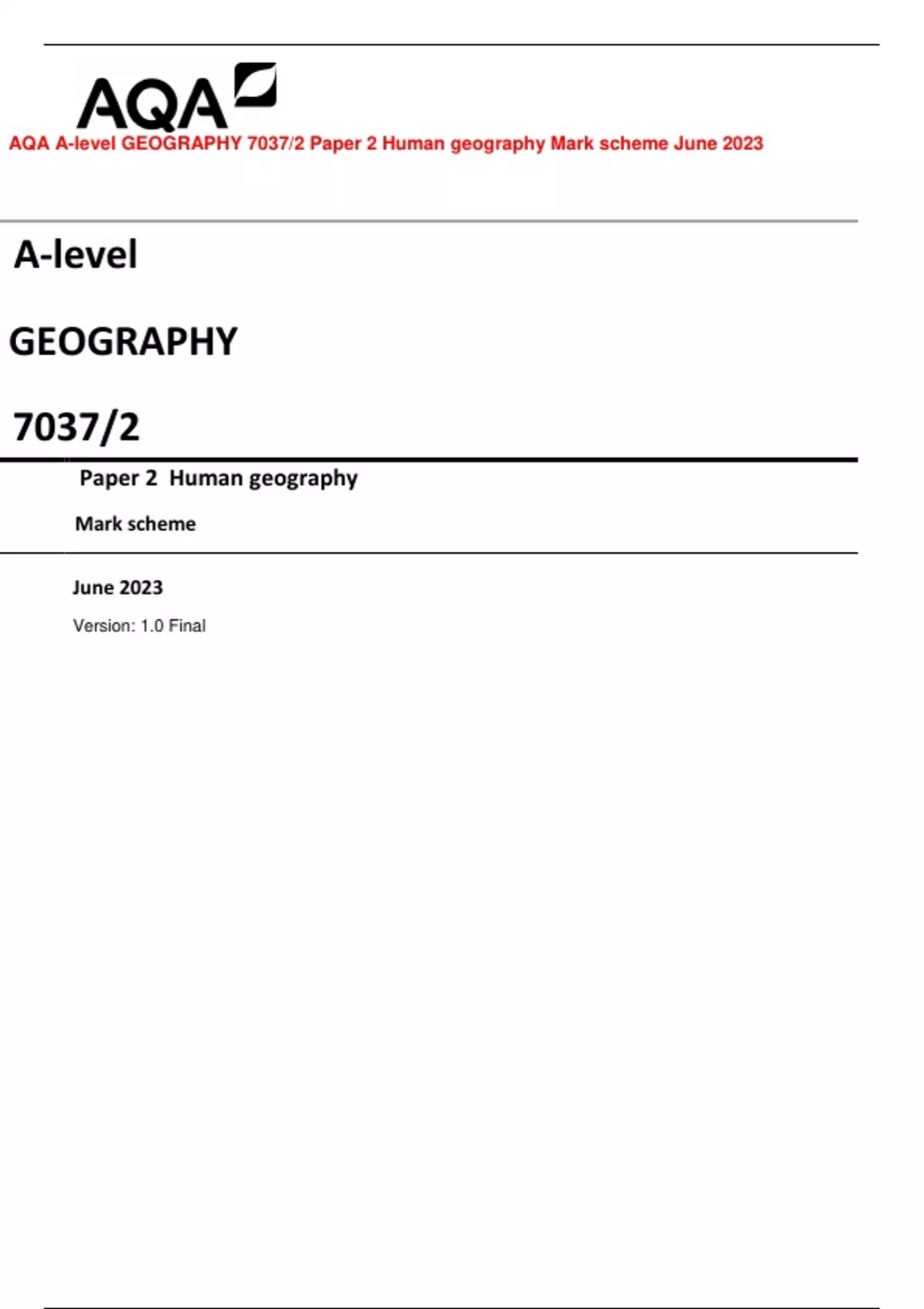 AQA A-level GEOGRAPHY 7037/2 Paper 2 Human geography Mark scheme June 2023