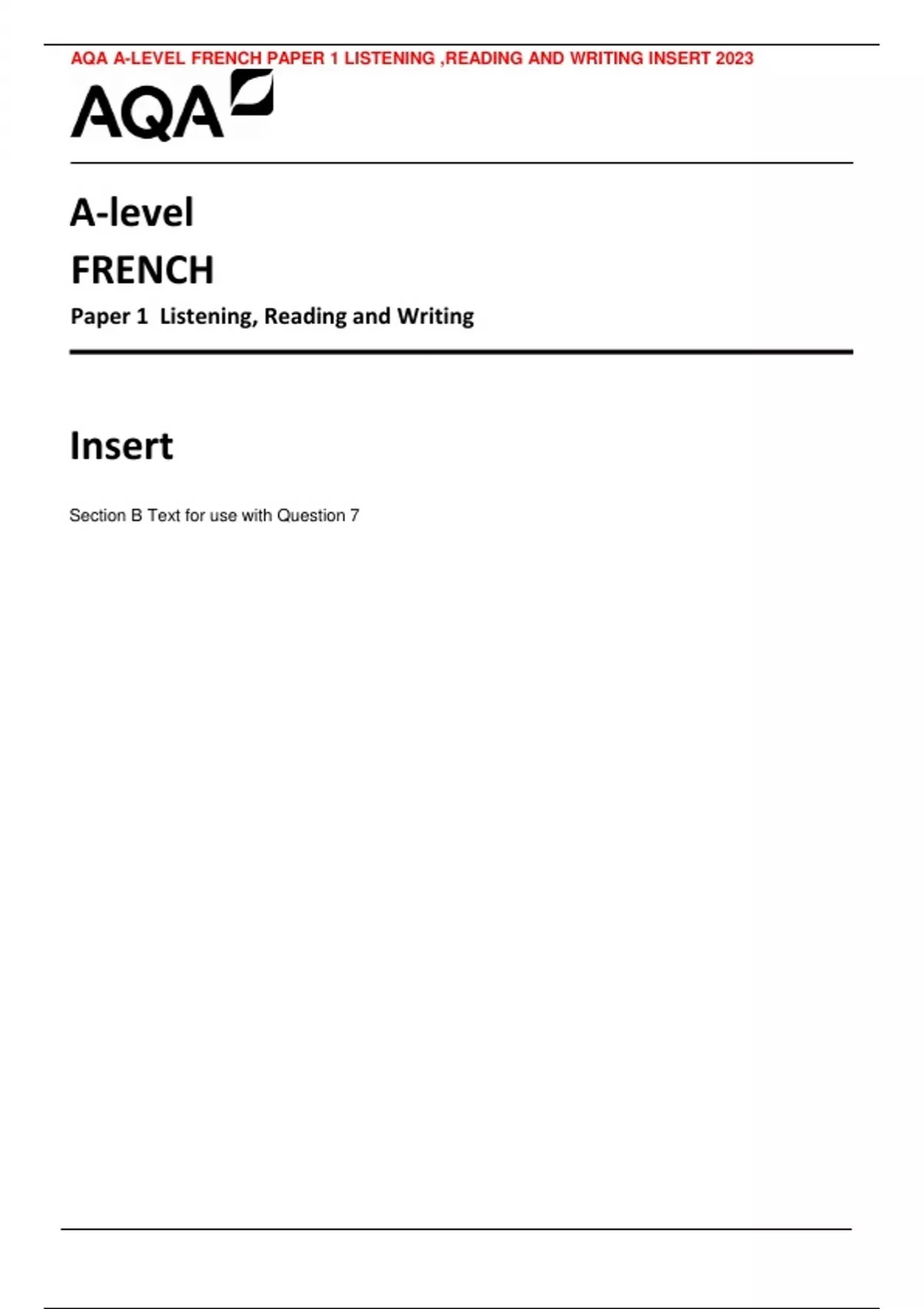 AQA A-LEVEL FRENCH PAPER 1 LISTENING ,READING AND WRITING INSERT 2023