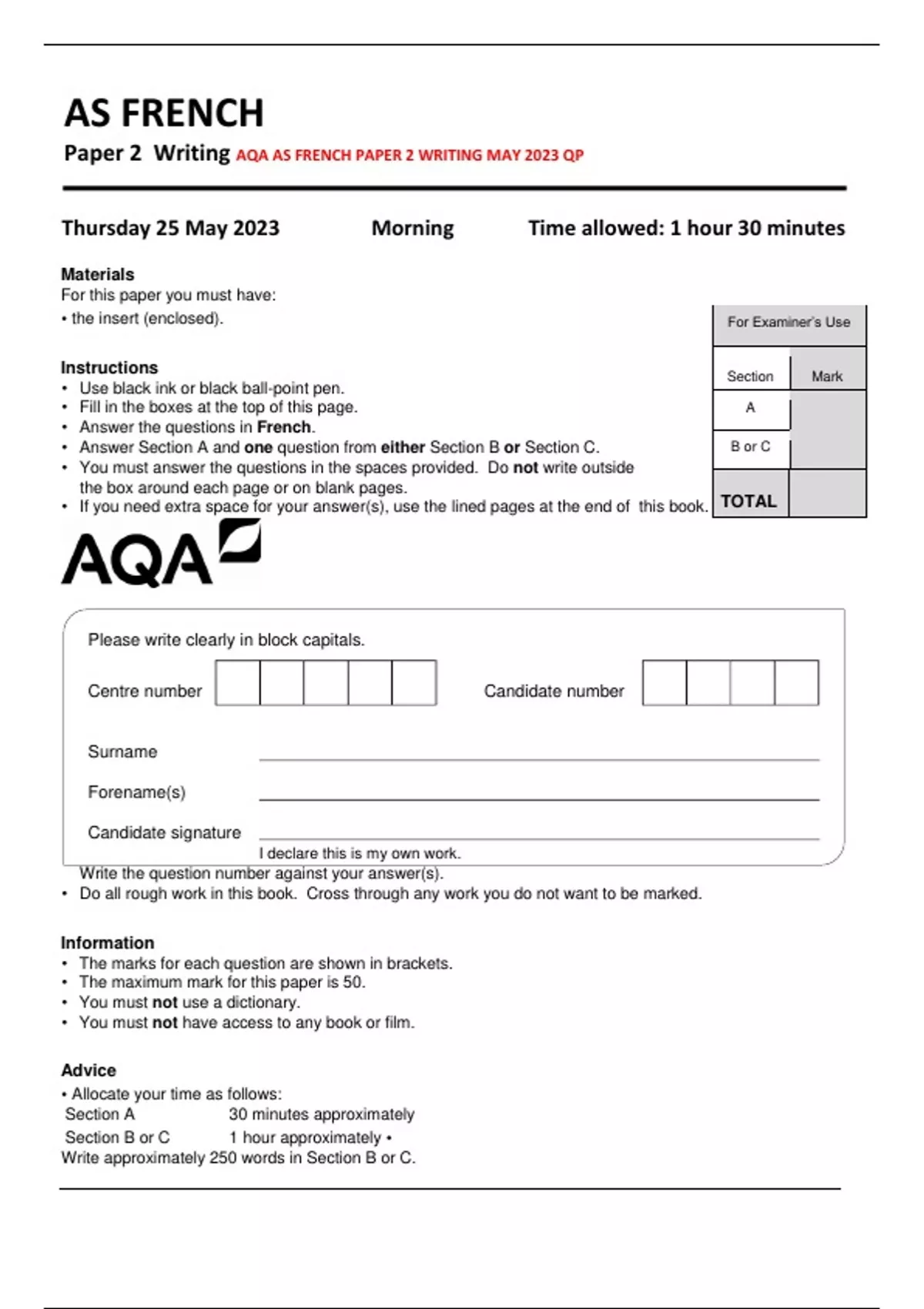 AQA AS FRENCH PAPER 2 WRITING MAY 2023 QP