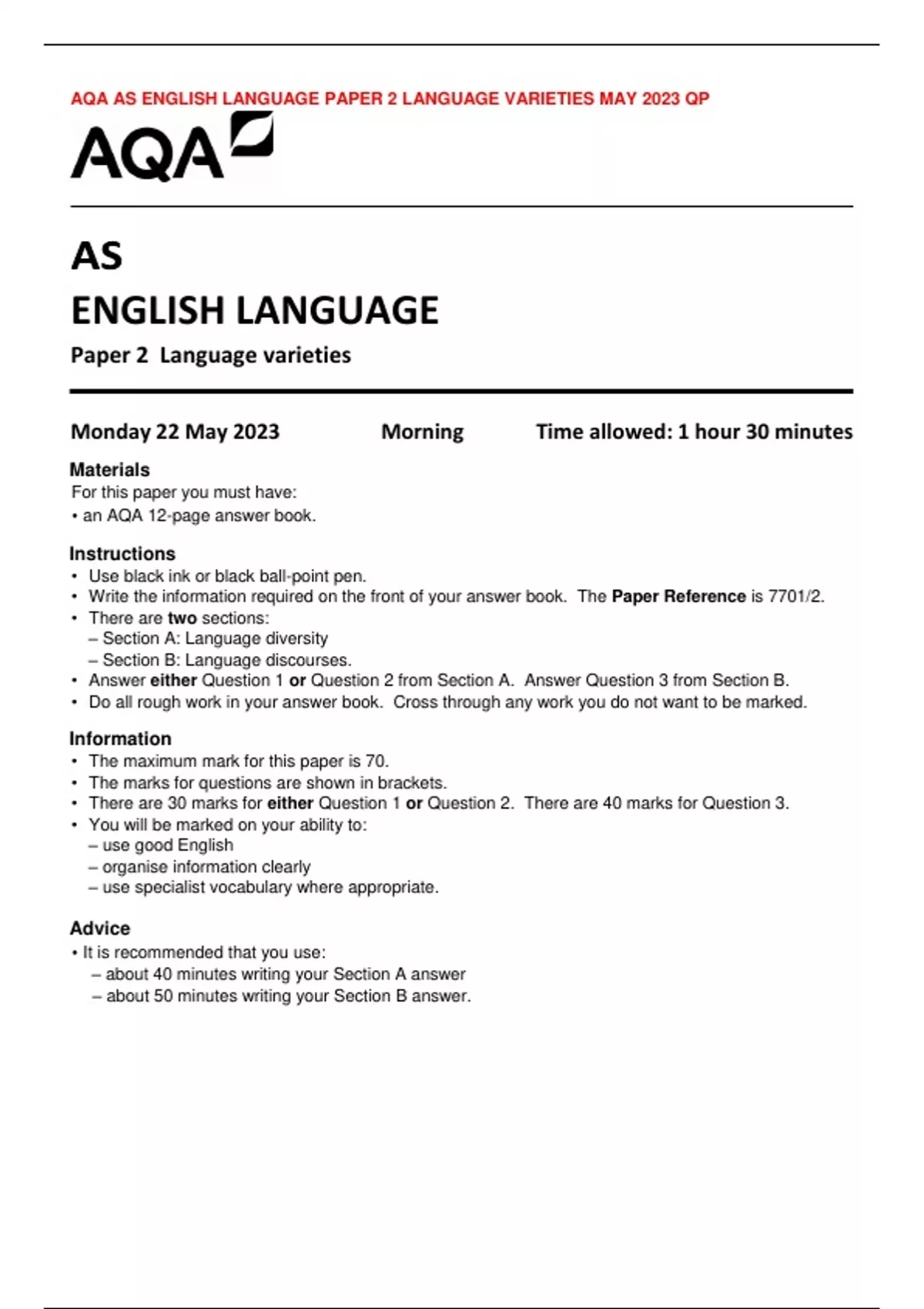 AQA AS ENGLISH LANGUAGE PAPER 2 LANGUAGE VARIETIES MAY 2023 QP