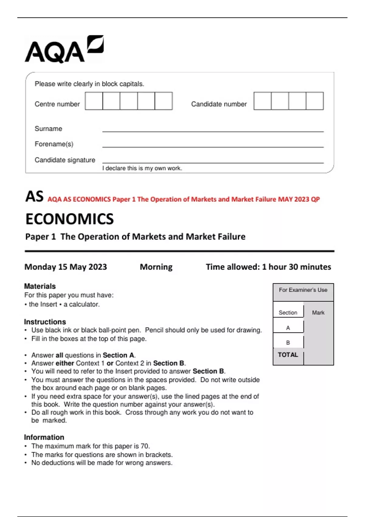 AQA AS ECONOMICS Paper 1 The Operation of Markets and Market Failure MAY 2023 QP