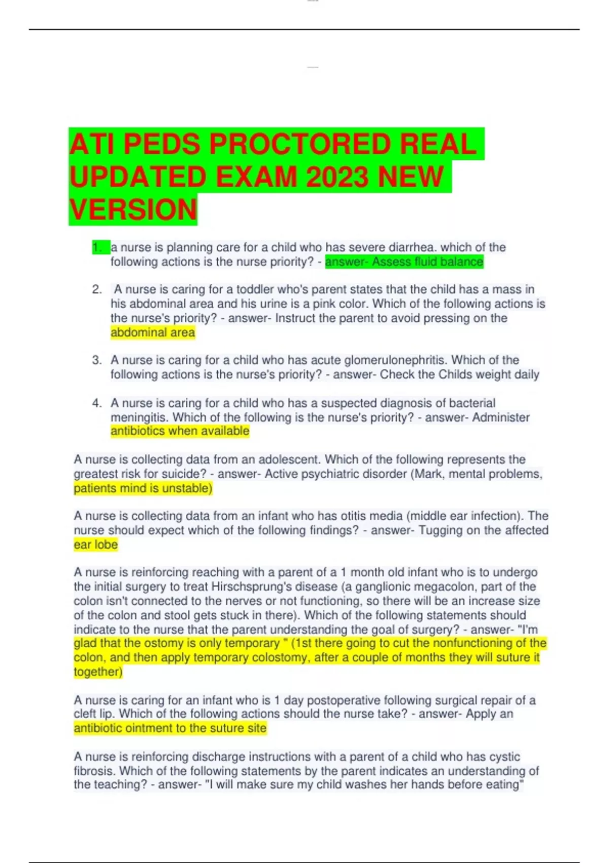 ATI PEDS PROCTORED REAL UPDATED EXAM 2023 NEW VERSION 1. a nurse is planning care for a child who has severe diarrhea. which of the following actions is the nurse priority? - answer- Assess fluid balance 2. A nurse is caring for a toddler who's parent states that the child has a mass in his abdominal area and his urine is a pink color. Which of the following actions is the nurse's priority? - answer- Instruct the parent to avoid pressing on the abdominal area 3. A nurse is caring for a child who has acute glomerulonephritis. Which of the following actions is the nurse's priority? - answer- Check the Childs weight daily 4. A nurse is caring for a child who has a suspected diagnosis of bacterial meningitis. Which of the following is the nurse's priority? - answer- Administer antibiotics when available A nurse is collecting data from an adolescent. Which of the following represents the greatest risk for suicide? - answer- Active psychiatric disorder (Mark, mental problems, patients mind is unstable) A nurse is collecting data from an infant who has otitis media (middle ear infection). The nurse should expect which of the following findings? - answer- Tugging on the affected ear lobe A nurse is reinforcing reaching with a parent of a 1 month old infant who is to undergo the initial surgery to treat Hirschsprung's disease (a ganglionic megacolon, part of the colon isn't connected to the nerves or not functioning, so there will be an increase size of the colon and stool gets stuck in there). Which of the following statements should indicate to the nurse that the parent understanding the goal of surgery? - answer- "I'm glad that the ostomy is only temporary " (1st there going to cut the nonfunctioning of the colon, and then apply temporary colostomy, after a couple of months they will suture it together) A nurse is caring for an infant who is 1 day postoperative following surgical repair of a cleft lip. Which of the following actions should the nurse take? - answer- Apply an antibiotic ointment to the suture site A nurse is reinforcing discharge instructions with a parent of a child who has cystic fibrosis. Which of the following statements by the parent indicates an understanding of the teaching? - answer- "I will make sure my child washes her hands before eating" lOMoARcPSD| A nurse working at a clinic speaks on the telephone with a parent of a 2-monthold infant. The parent tells the nurse that the infant has projectile vomiting followed by hunger after meals. Which of the following response by the nurse is appropriate? - answer- "Bring your infant into the clinic today to be seen" lOMoARcPSD| A nurse is caring for a 4 year old child who is 2 days postoperative following the insertion of a ventriculoperitoneal shunt. Which of the following findings should the nurse identify as the priority . (causes icp hydrocephalus) - answer- lethargy (high pitched cry, respiratory changes, bradycardia, wide pulse pressure, irritability a nurse is caring for a child following an open reduction and internal fixation of a fractured femur and application of a cast. The cast has a window cut in it for viewing of the incision. Which of the following actions should the nurse take first? - answerPerform neurovascular checks of the affected extremity (check for infection, color, capillary refill, redness) A nurse is an urgent care clinic is assisting with the care of a toddler who ingested 30 tablets of aspirin. Which of the following substances should the nurse administer to the toddler? - answer- Activated charcoal (can work with toxin, poison. Given through ng tube absorbs toxins)