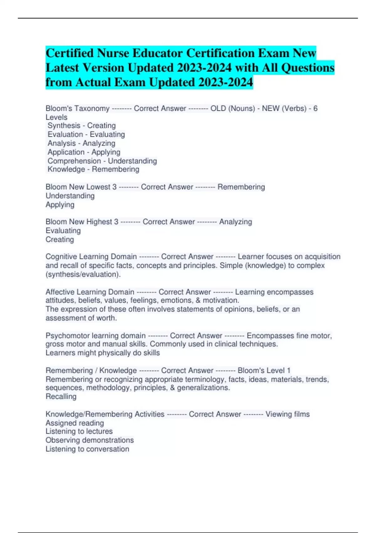 Certified Nurse Educator Certification Exam New Latest Version Updated with All Questions from Actual Exam Updated