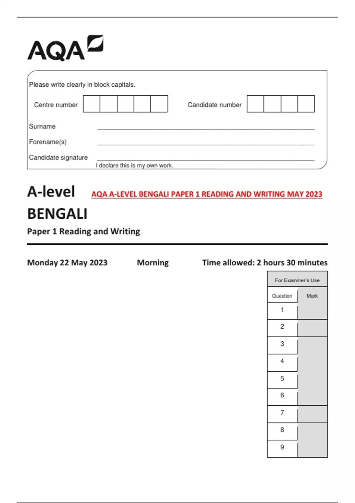 AQA A-LEVEL BENGALI PAPER 1 READING AND WRITING MAY 2023