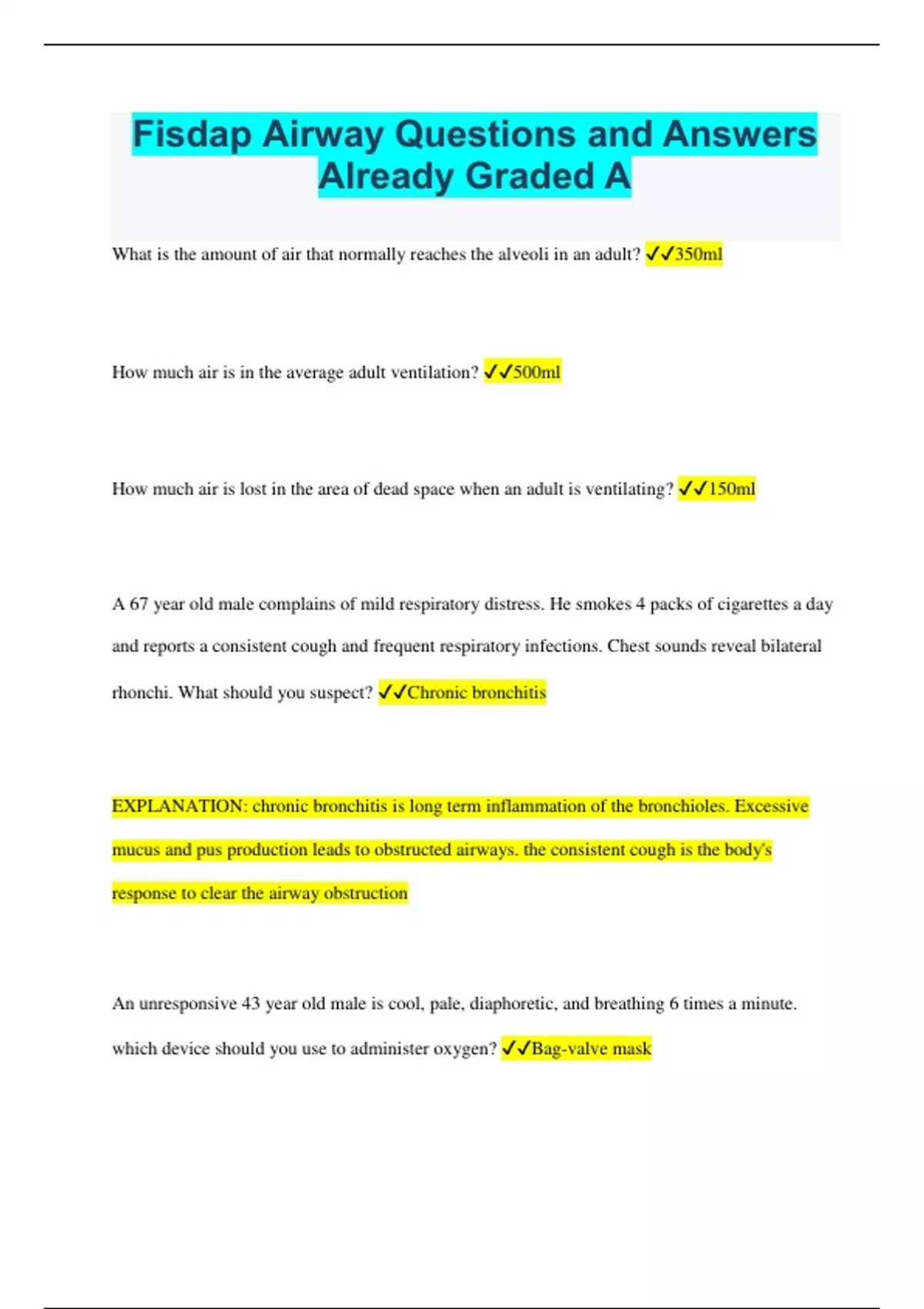 Fisdap Airway Questions and Answers Already Graded A
