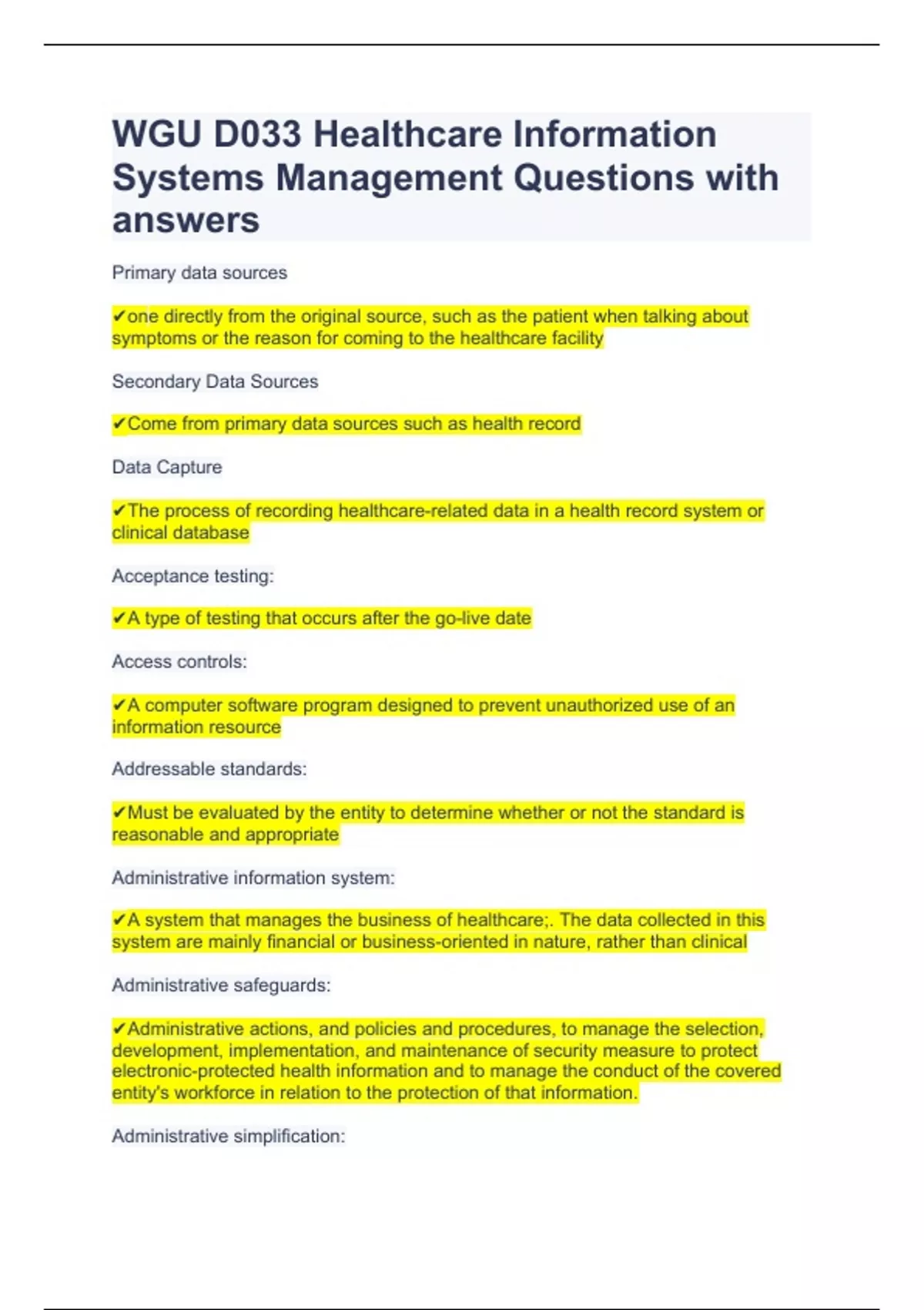 WGU D033 Healthcare Information Systems Management Questions with answers