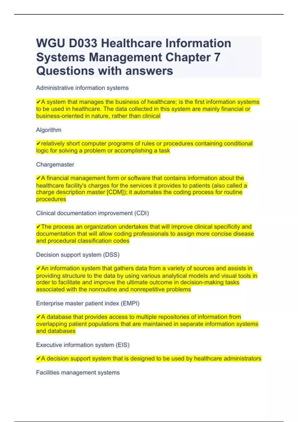 WGU D033 Healthcare Information Systems Management Chapter 7 Questions with answers