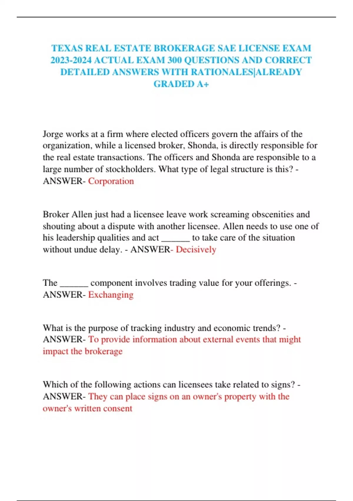 TEXAS REAL ESTATE BROKERAGE SAE LICENSE EXAM ACTUAL EXAM 300 QUESTIONS AND CORRECT DETAILED ANSWERS WITH RATIONALES|ALREADY GRADED A+