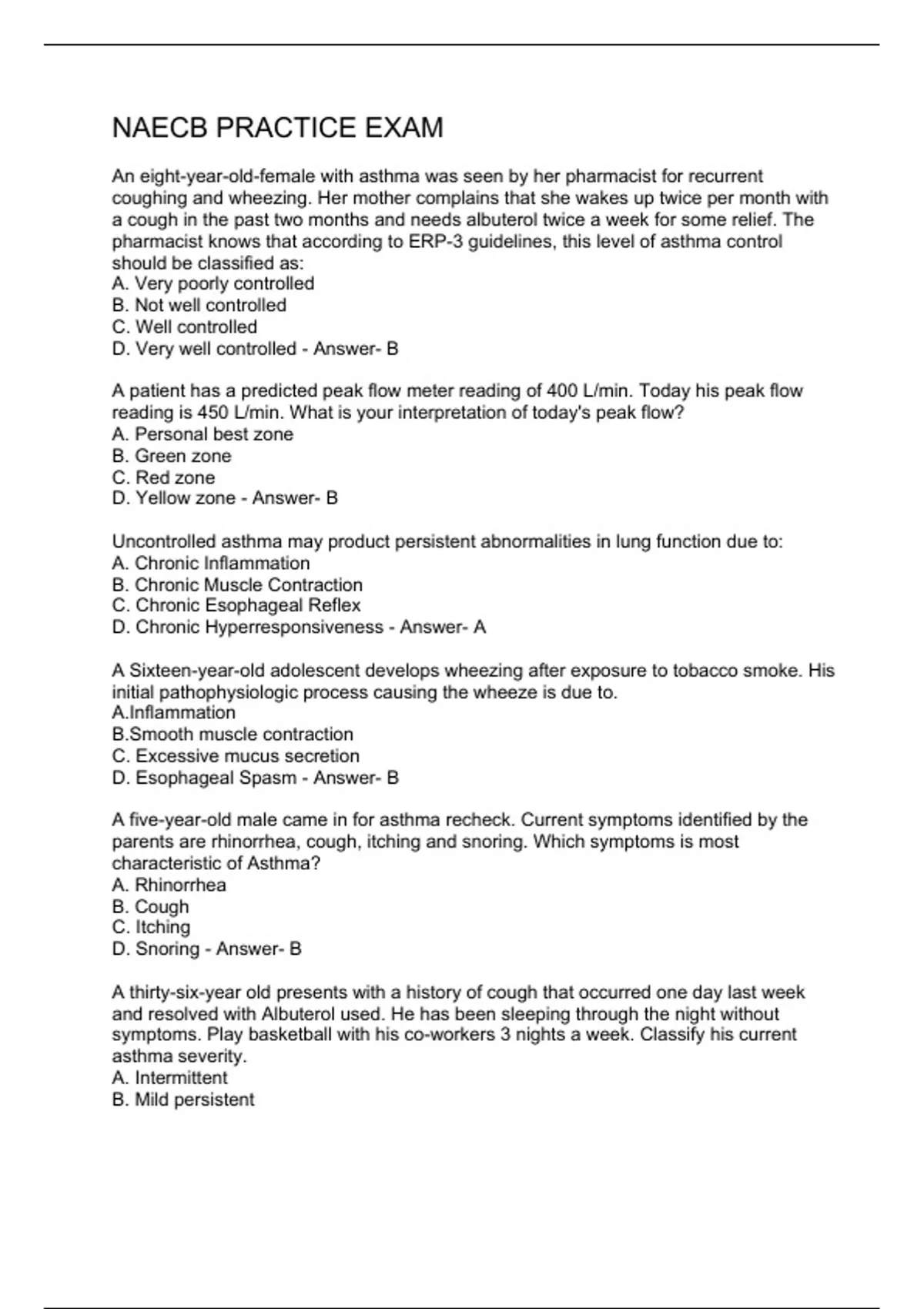 An eight-year-old-female with asthma was seen by her pharmacist for recurrent coughing and wheezing. Her mother complains that she wakes up twice per month with a cough in the past two months and needs albuterol twice a week for some relief. The pharmacist knows that according to ERP-3 guidelines, this level of asthma control should be classified as: A. Very poorly controlled B. Not well controlled C. Well controlled D. Very well controlled - Answer- B A patient has a predicted peak flow meter reading of 400 L/min. Today his peak flow reading is 450 L/min. What is your interpretation of today's peak flow? A. Personal best zone B. Green zone C. Red zone D. Yellow zone - Answer- B Uncontrolled asthma may product persistent abnormalities in lung function due to: A. Chronic Inflammation B. Chronic Muscle Contraction C. Chronic Esophageal Reflex D. Chronic Hyperresponsiveness - Answer- A A Sixteen-year-old adolescent develops wheezing after exposure to tobacco smoke. His initial pathophysiologic process causing the wheeze is due to. A.Inflammation B.Smooth muscle contraction C. Excessive mucus secretion D. Esophageal Spasm - Answer- B A five-year-old male came in for asthma recheck. Current symptoms identified by the parents are rhinorrhea, cough, itching and snoring. Which symptoms is most characteristic of Asthma? A. Rhinorrhea B. Cough C. Itching D. Snoring - Answer- B A thirty-six-year old presents with a history of cough that occurred one day last week and resolved with Albuterol used. He has been sleeping through the night without symptoms. Play basketball with his co-workers 3 nights a week. Classify his current asthma severity. A. Intermittent B. Mild p