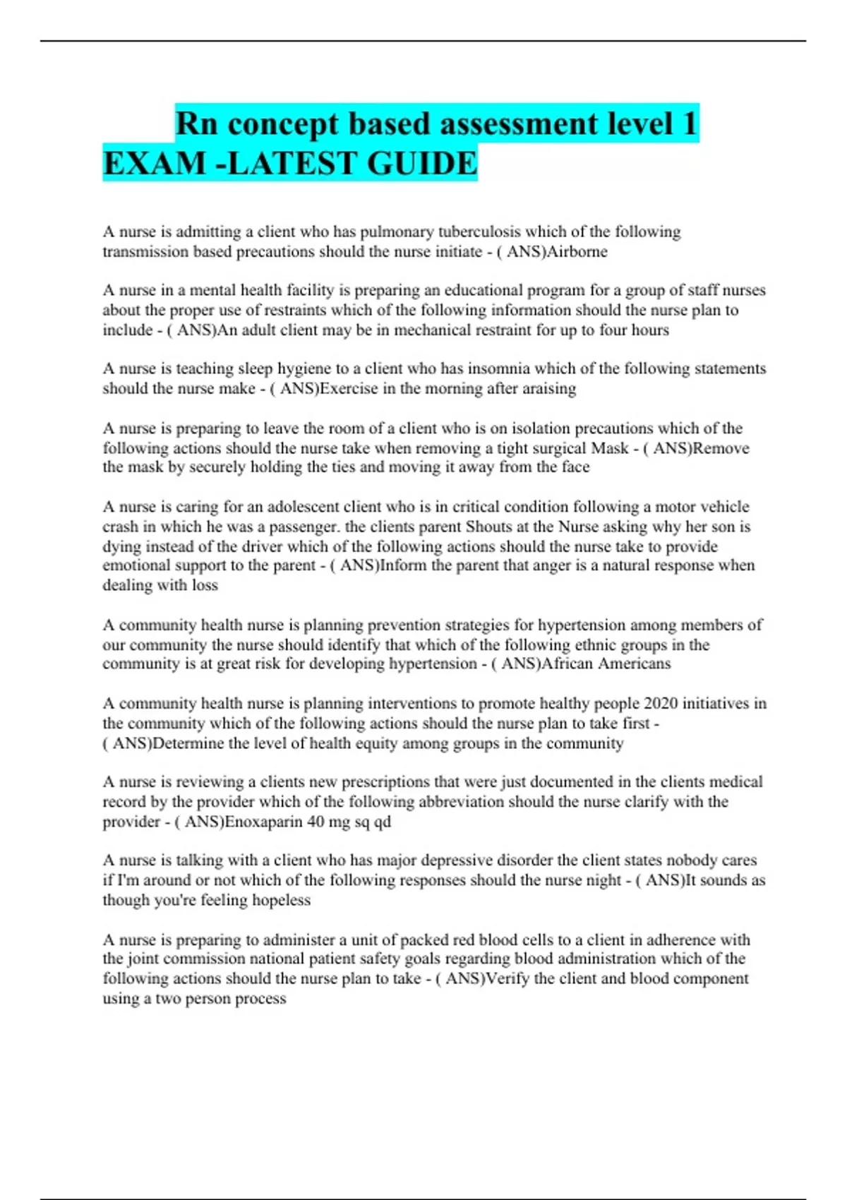 Rn concept based assessment level 1 EXAM -LATEST GUIDE
