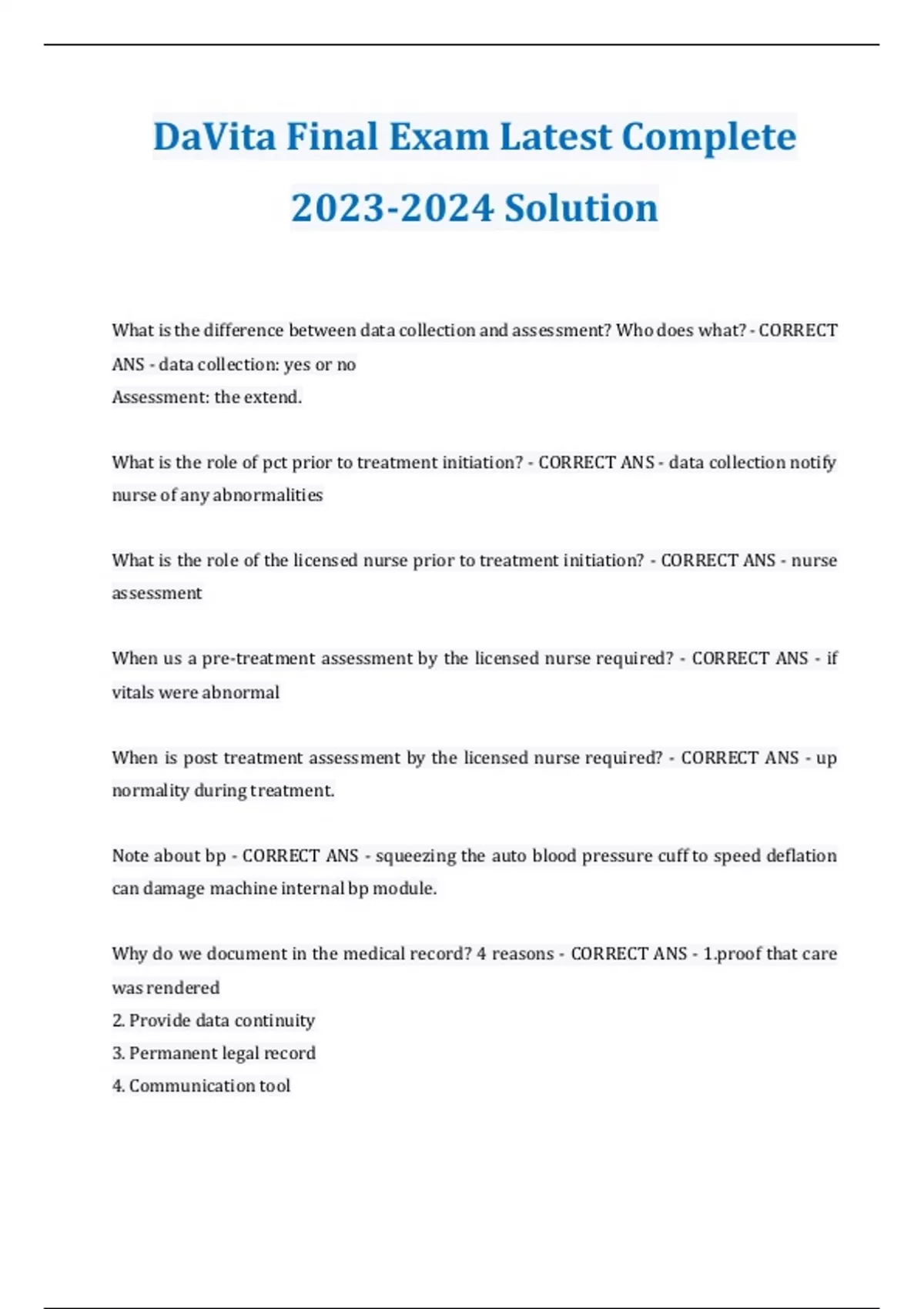 DaVita Final Exam Latest Complete Solution What is the difference between data collection and assessment? Who does what? - CORRECT ANS - data collection: yes or no Assessment: the extent. What is the role of pct prior to treatment initiation? - CORRECT ANS - data collection notify nurse of any abnormalities What is the role of the licensed nurse prior to treatment initiation? - CORRECT ANS - nurse assessment When us a pre-treatment assessment by the licensed nurse required? - CORRECT ANS - if vitals were abnormal When is post treatment assessment by the licensed nurse required? - CORRECT ANS - up normality during treatment. Note about bp - CORRECT ANS - squeezing the auto blood pressure cuff to speed deflation can damage machine internal bp module. Why do we document in the medical record? 4 reasons - CORRECT ANS - that care was rendered 2. Provide data continuity 3. Permanent legal record 4. Communication tool