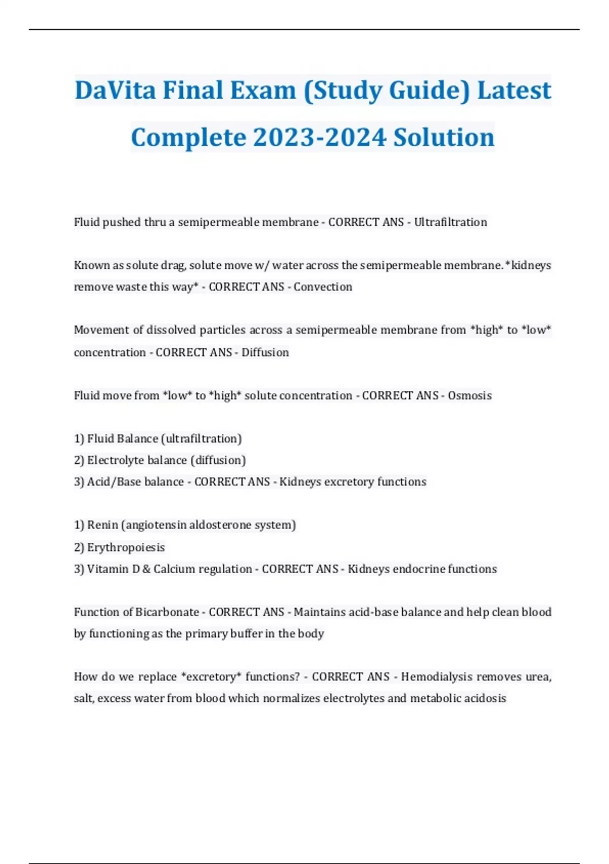 DaVita Final Exam (Study Guide) Latest Complete Solution Fluid pushed through a semipermeable membrane - CORRECT ANS - Ultrafiltration Known as solute drag, solutes move w/ water across the semipermeable membrane. *kidneys remove waste this way* - CORRECT ANS - Convection Movement of dissolved particles across a semipermeable membrane from *high* to *low* concentration - CORRECT ANS - Diffusion Fluid move from *low* to *high* solute concentration - CORRECT ANS - Osmosis 1) Fluid Balance (ultrafiltration) 2) Electrolyte balance (diffusion) 3) Acid/Base balance - CORRECT ANS - Kidneys excretory functions 1) Renin (angiotensin aldosterone system) 2) Erythropoiesis 3) Vitamin D & Calcium regulation - CORRECT ANS - Kidneys endocrine functions Function of Bicarbonate - CORRECT ANS - Maintains acid-base balance and help clean blood by functioning as the primary buffer in the body How do we replace *excretory* functions? - CORRECT ANS - Hemodialysis removes urea, salt, excess water from blood which normalizes electrolytes and metabolic acidosis Hormones replaced by medications such as Epogen, Iron, Antihypertensive (ACE inhibitors), Phosphate binders, Vitamins D, Calcimetric agents - CORRECT ANS - How we replace *endocrine* functions? 1) Edema & Pulmonary Edema 2) Hypertension 3) Chronic Heart Failure 4) Shortness of breath 5) Headaches - CORRECT ANS - Signs & symptoms of fluid imbalance Hypertension leads to - CORRECT ANS - Left Ventricular Hypertrophy (LVH)