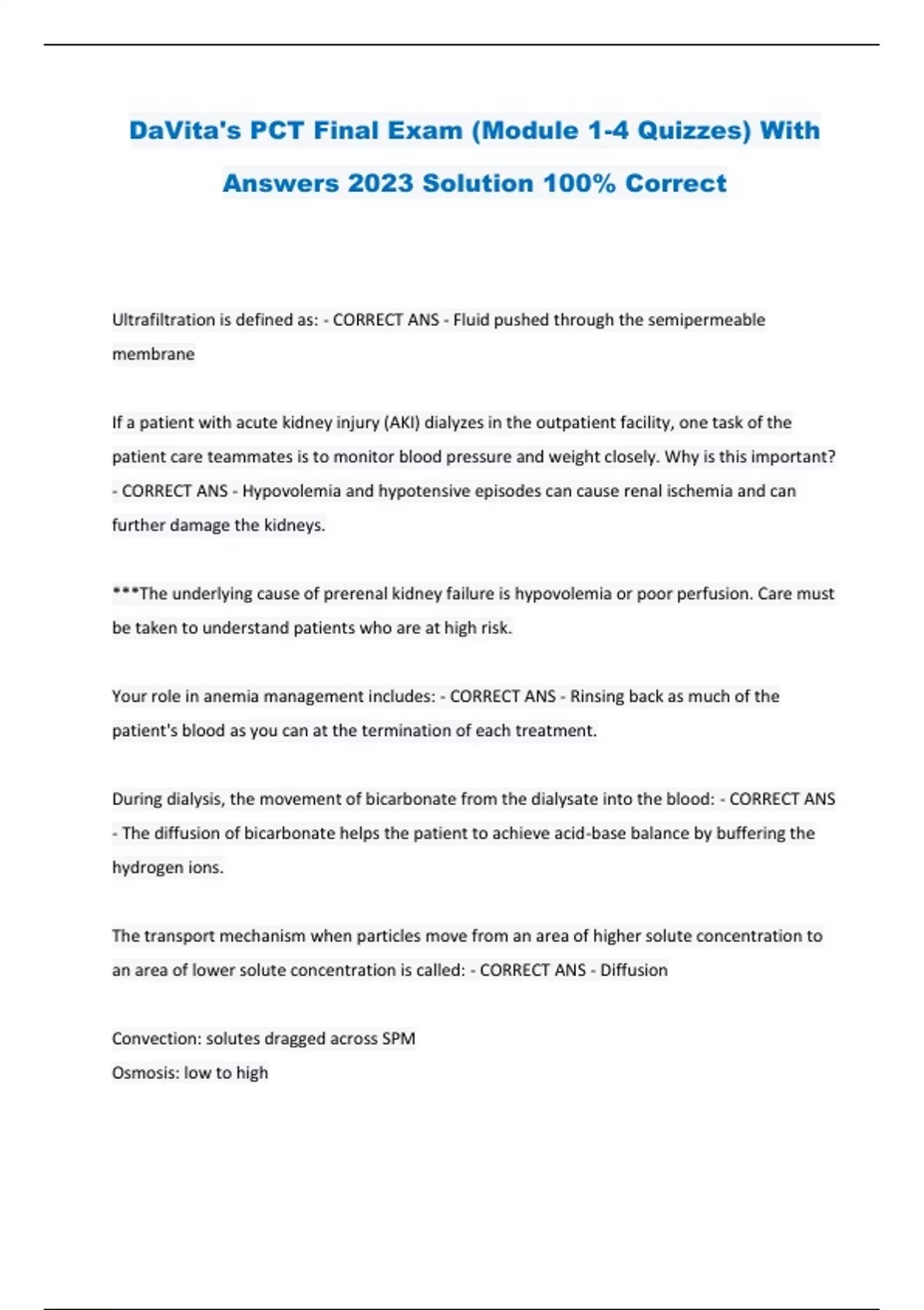 DaVita's PCT Final Exam (Module 1-4 Quizzes) With Answers 2023 Solution 100% Correct Ultrafiltration is defined as: - CORRECT ANS - Fluid pushed through the semipermeable membrane If a patient with acute kidney injury (AKI) dialyzes in the outpatient facility, one task of the patient care teammates is to monitor blood pressure and weight closely. Why is this important? - CORRECT ANS - Hypovolemia and hypotensive episodes can cause renal ischemia and can further damage the kidneys. ***The underlying cause of prerenal kidney failure is hypovolemia or poor perfusion. Care must be taken to understand patients who are at high risk. Your role in anemia management includes: - CORRECT ANS - Rinsing back as much of the patient's blood as you can at the termination of each treatment. During dialysis, the movement of bicarbonate from the dialysate into the blood: - CORRECT ANS - The diffusion of bicarbonate helps the patient to achieve acid-base balance by buffering the hydrogen ions. The transport mechanism when particles move from an area of higher solute concentration to an area of lower solute concentration is called: - CORRECT ANS - Diffusion Convection: solutes dragged across SPM Osmosis: low to high TRUE OR FALSE: Hemodialysis patients are at increased risk of contracting Hepatitis B. - CORRECT ANS - True, the virus can be transmitted from the use of multidose drug vials and contamination of medical equipment. Dialysis patients are immuno-suppressed.