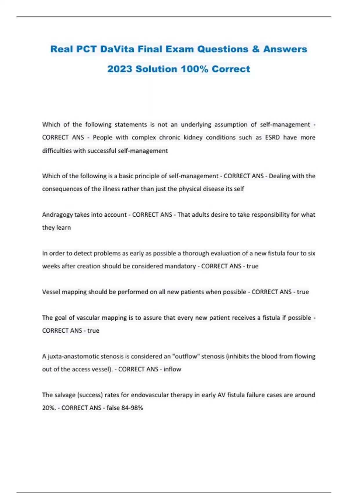 Real PCT DaVita Final Exam Questions & Answers 2023 Solution 100% Correct Which of the following statements is not an underlying assumption of self-management - CORRECT ANS - People with complex chronic kidney conditions such as ESRD have more difficulties with successful self-management Which of the following is a basic principle of self-management - CORRECT ANS - Dealing with the consequences of the illness rather than just the physical disease its self Andragogy takes into account - CORRECT ANS - That adults desire to take responsibility for what they learn In order to detect problems as early as possible a thorough evaluation of a new fistula four to six weeks after creation should be considered mandatory - CORRECT ANS - true Vessel mapping should be performed on all new patients when possible - CORRECT ANS - true The goal of vascular mapping is to assure that every new patient receives a fistula if possible - CORRECT ANS - true A juxta-anastomotic stenosis is considered an "outflow" stenosis (inhibits the blood from flowing out of the access vessel). - CORRECT ANS - inflow The salvage (success) rates for endovascular therapy in early AV fistula failure cases are around 20%. - CORRECT ANS - false 84-98% Venous stenosis is the most common cause of late fistula loss. - CORRECT ANS - true