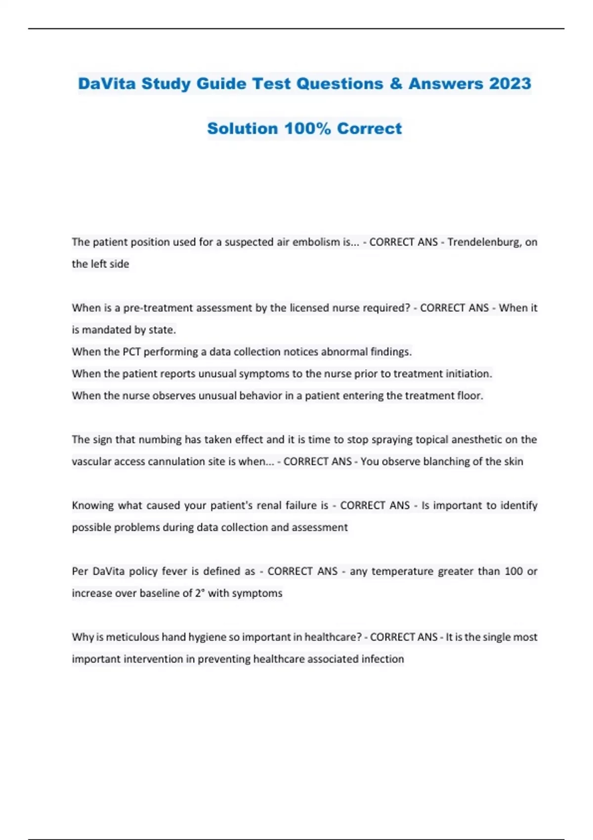 DaVita Study Guide Test Questions & Answers 2023 Solution 100% Correct The patient position used for a suspected air embolism is... - CORRECT ANS - Trendelenburg, on the left side When is a pre-treatment assessment by the licensed nurse required? - CORRECT ANS - When it is mandated by state. When the PCT performing a data collection notices abnormal findings. When the patient reports unusual symptoms to the nurse prior to treatment initiation. When the nurse observes unusual behavior in a patient entering the treatment floor. The sign that numbing has taken effect and it is time to stop spraying topical anesthetic on the vascular access cannulation site is when... - CORRECT ANS - You observe blanching of the skin Knowing what caused your patient's renal failure is - CORRECT ANS - Is important to identify possible problems during data collection and assessment Per DaVita policy fever is defined as - CORRECT ANS - any temperature greater than 100 or increase over baseline of 2° with symptoms Why is meticulous hand hygiene so important in healthcare? - CORRECT ANS - It is the single most important intervention in preventing healthcare associated infection At what time do you perform water hardness testing - CORRECT ANS - At the end of the treatment day The nephrologist has ordered the use of hemostatic sponges such as Sue Seal for your patient what is the correct procedure when using the sponges - CORRECT ANS - Remove the hemostatic sponge after hemostasis has been achieved and dress the needle sites with sterile gauze or Band-Aid