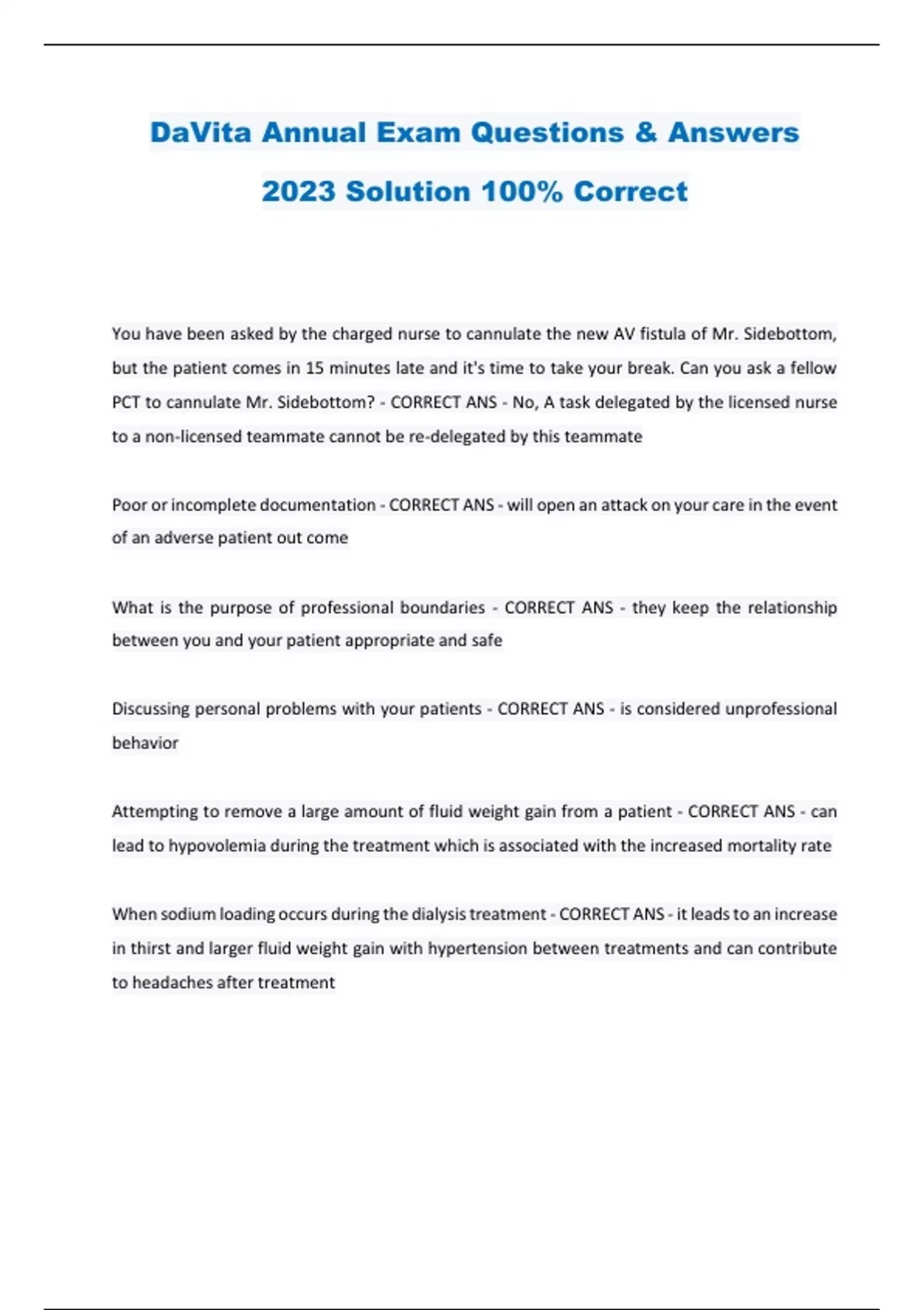 DaVita Annual Exam Questions & Answers 2023 Solution 100% Correct You have been asked by the charged nurse to cannulate the new AV fistula of Mr. Sidebottom, but the patient comes in 15 minutes late and it's time to take your break. Can you ask a fellow PCT to cannulate Mr. Sidebottom? - CORRECT ANS - No, A task delegated by the licensed nurse to a non-licensed teammate cannot be re-delegated by this teammate Poor or incomplete documentation - CORRECT ANS - will open an attack on your care in the event of an adverse patient out come What is the purpose of professional boundaries - CORRECT ANS - they keep the relationship between you and your patient appropriate and safe Discussing personal problems with your patients - CORRECT ANS - is considered unprofessional behavior Attempting to remove a large amount of fluid weight gain from a patient - CORRECT ANS - can lead to hypovolemia during the treatment which is associated with the increased mortality rate When sodium loading occurs during the dialysis treatment - CORRECT ANS - it leads to an increase in thirst and larger fluid weight gain with hypertension between treatments and can contribute to headaches after treatment during data collection Mrs. Sweetland mentions her bowel movement have been looking quite dark the last two days and asks if this could be caused by something she ate you - CORRECT ANS - inform the nurse to assess Mrs. Sweetland prior to treatment initiation