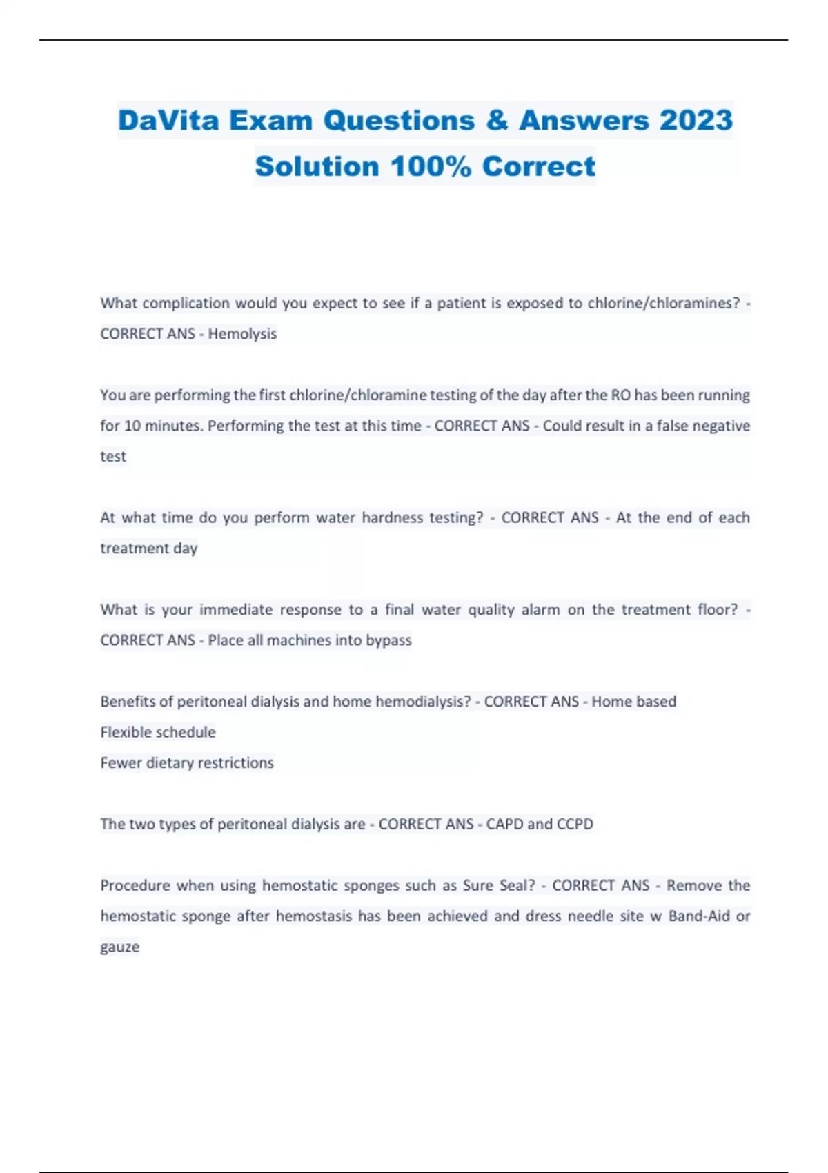 DaVita Exam Questions & Answers 2023 Solution 100% Correct What complication would you expect to see if a patient is exposed to chlorine/chloramines? - CORRECT ANS - Hemolysis You are performing the first chlorine/chloramine testing of the day after the RO has been running for 10 minutes. Performing the test at this time - CORRECT ANS - Could result in a false negative test At what time do you perform water hardness testing? - CORRECT ANS - At the end of each treatment day What is your immediate response to a final water quality alarm on the treatment floor? - CORRECT ANS - Place all machines into bypass Benefits of peritoneal dialysis and home hemodialysis? - CORRECT ANS - Home based Flexible schedule Fewer dietary restrictions The two types of peritoneal dialysis are - CORRECT ANS - CAPD and CCPD Procedure when using hemostatic sponges such as Sure Seal? - CORRECT ANS - Remove the hemostatic sponge after hemostasis has been achieved and dress needle site w Band-Aid or gauze - CORRECT ANS - Two weeks