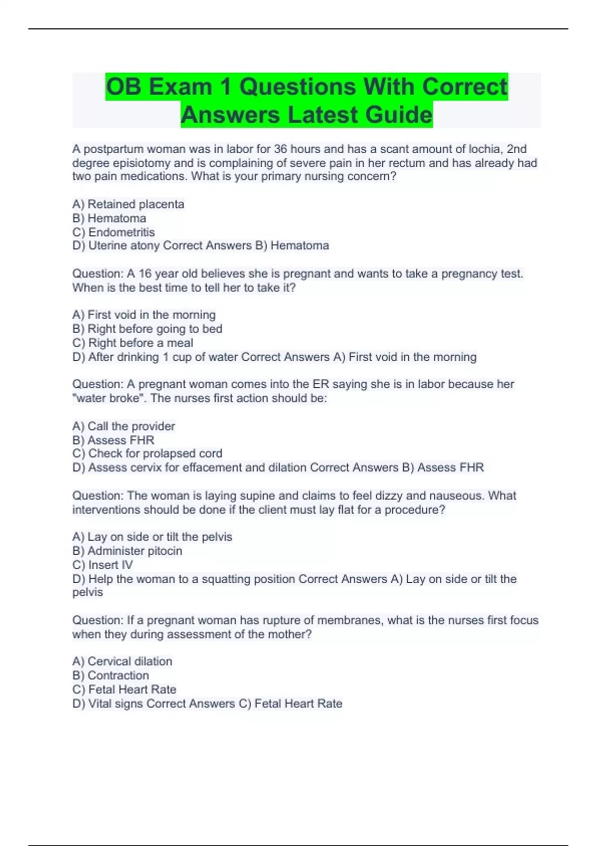 OB Exam 1 Questions With Correct Answers Latest Guide