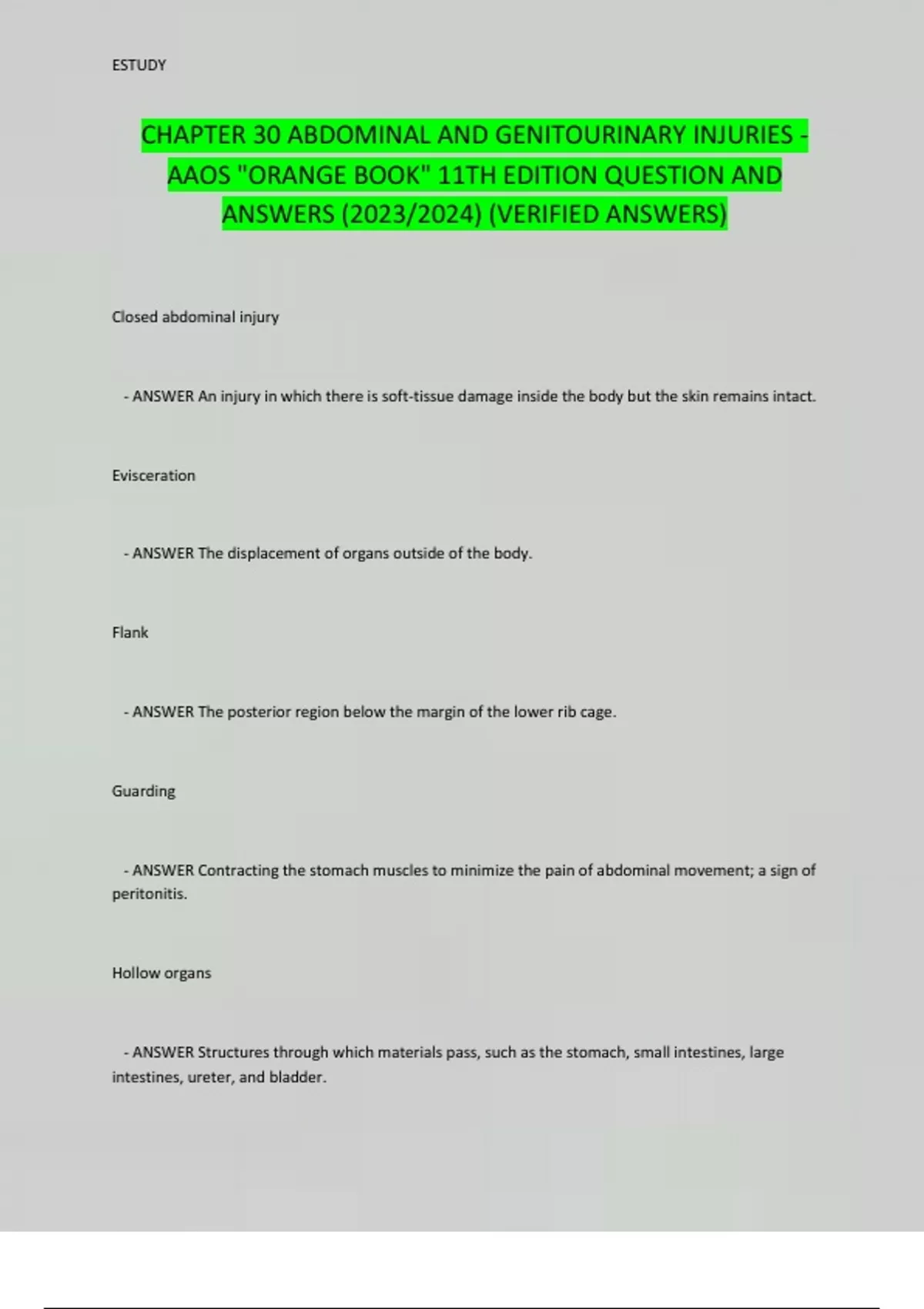 CHAPTER 30 ABDOMINAL AND GENITOURINARY INJURIES - AAOS "ORANGE BOOK" 11TH EDITION QUESTION AND ANSWERS (2023/2024) (VERIFIED ANSWERS)