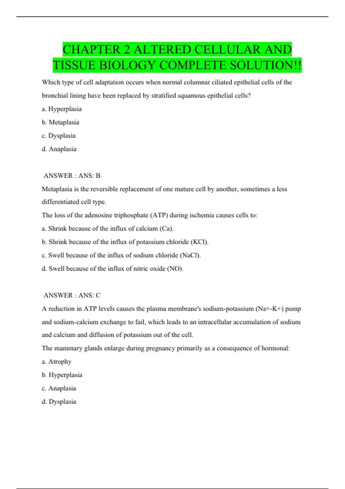 CHAPTER 2: ALTERED CELLULAR AND TISSUE BIOLOGY COMPLETE SOLUTION!!
