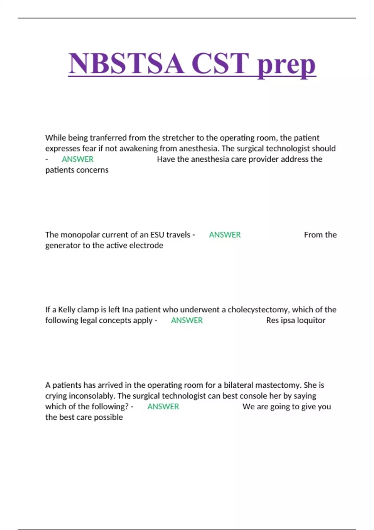NBSTSA CST prep While being tranferred from the stretcher to the operating room, the patient expresses fear if not awakening from anesthesia. The surgical technologist should - ANSWER Have the anesthesia care provider address the patients concerns The monopolar current of an ESU travels - ANSWER From the generator to the active electrode If a Kelly clamp is left Ina patient who underwent a cholecystectomy, which of the following legal concepts apply - ANSWER Res ipsa loquitor A patients has arrived in the operating room for a bilateral mastectomy. She is crying inconsolably. The surgical technologist can best console her by saying which of the following? - ANSWER We are going to give you the best care possible If the parents of a defendant minor requiring emergency surgery cannot be located, the operative consent form for surgery may be signed by - ANSWER Two consulting physicians A surgical technologist sees a neighbor being admitted. How should the surgical technologist respond? - ANSWER Do not acknowledge the neighbor until greeted first Anterior and posterior knee stability is influenced by the dynamics of the - ANSWER Cruciate ligaments Encloses the patella and secures it in front of the knee joint - ANSWER The patellar tendon