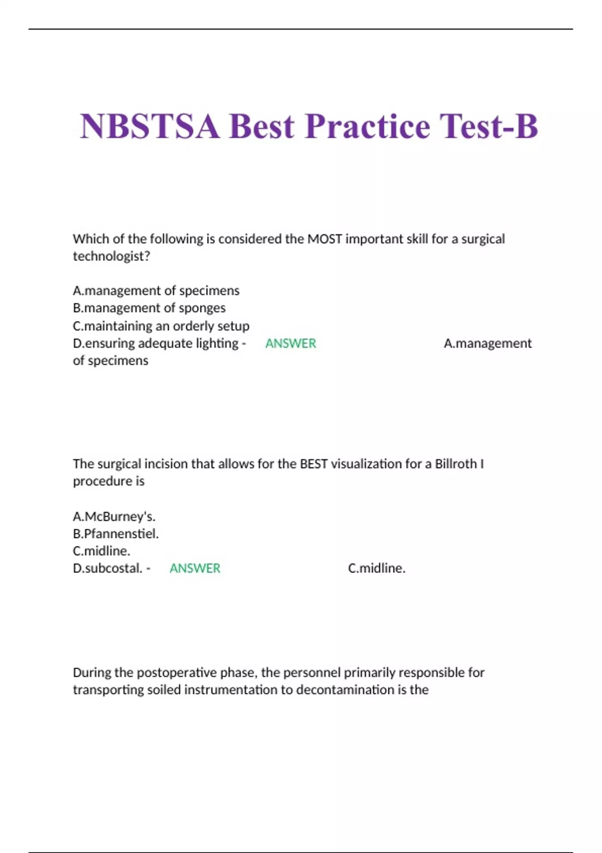 NBSTSA Best Practice Test-B Which of the following is considered the MOST important skill for a surgical technologist? A.management of specimens B.management of sponges C.maintaining an orderly setup D.ensuring adequate lighting - ANSWER A.management of specimens The surgical incision that allows for the BEST visualization for a Billroth I procedure is A.McBurney's. B.Pfannenstiel. C.midline. D.subcostal. - ANSWER C.midline. During the postoperative phase, the personnel primarily responsible for transporting soiled instrumentation to decontamination is the A.housekeeping staff. B.anesthesia technician. C.surgical technologist. D.central processing technician. - ANSWER C.surgical technologist. CSF is formed in the lateral ventricles of a patient and may not properly flow into the third ventricle through the foramen of A.Magendie into the fourth ventricle. B.Monro into the fourth ventricle. C.Sylvius into the fourth ventricle. D.Luschka into the fourth ventricle. - ANSWER C.Sylvius into the fourth ventricle. During an excisional biopsy of sentinel nodes, the surgical technologist should prepare specimens using which of the following methods? A.Place on a Raytec to be handed off to the circulator. B.Separate on Telfa and pass to the circulator. C.Place in separate containers and identify. D.Place in specimen container held by the circulator using a hemostat. - ANSWER C.Place in separate containers and identify. A surgical technologist received the following medications onto the sterile field: 0.9% sodium chloride, bacitracin 1 gm, and 0.25% Marcaine with epinephrine. Which of the following is the MOST appropriate way to label these medications? A.saline + bacitracin and .25 Marcaine + epinephrine B.NACL + 1 gm baci and 0.25 marc w/epi C.saline + baci and 0.25% marc with epi D.0.9% saline + 1 gm bacitracin and 0.25% Marcaine with epinephrine - ANSWER D.0.9% saline + 1 gm bacitracin and 0.25% Marcaine with epinephrine
