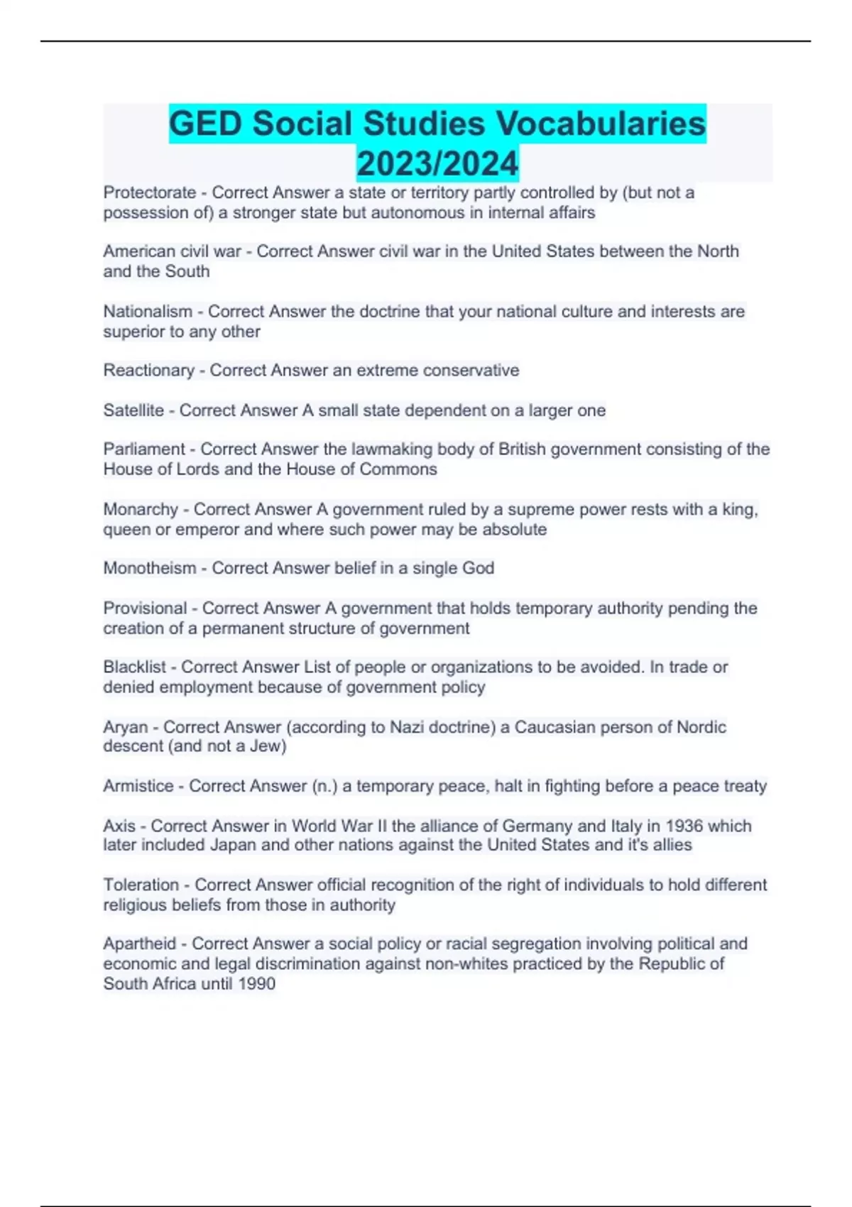 Protectorate - Correct Answer a state or territory partly controlled by (but not a possession of) a stronger state but autonomous in internal affairs American civil war - Correct Answer civil war in the United States between the North and the South Nationalism - Correct Answer the doctrine that your national culture and interests are superior to any other Reactionary - Correct Answer an extreme conservative Satellite - Correct Answer A small state dependent on a larger one Parliament - Correct Answer the lawmaking body of British government consisting of the House of Lords and the House of Commons Monarchy - Correct Answer A government ruled by a supreme power rests with a king, queen or emperor and where such power may be absolute Monotheism - Correct Answer belief in a single God Provisional - Correct Answer A government that holds temporary authority pending the creation of a permanent structure of government Blacklist - Correct Answer List of people or organizations to be avoided. In trade or denied employment because of government policy Aryan - Correct Answer (according to Nazi doctrine) a Caucasian person of Nordic descent (and not a Jew) Armistice - Correct Answer (n.) a temporary peace, halt in fighting before a peace treaty Axis - Correct Answer in World War II the alliance of Germany and Italy in 1936 which later included Japan and other nations against the United States and it's allies Toleration - Correct Answer official recognition of the right of individuals to hold different religious beliefs from those in authority Apartheid - Correct Answer a social policy or racial segregation involving political and economic and legal discrimination against non-whites practiced by the Republic of South Africa until 1990 Civil Service - Correct Answer
