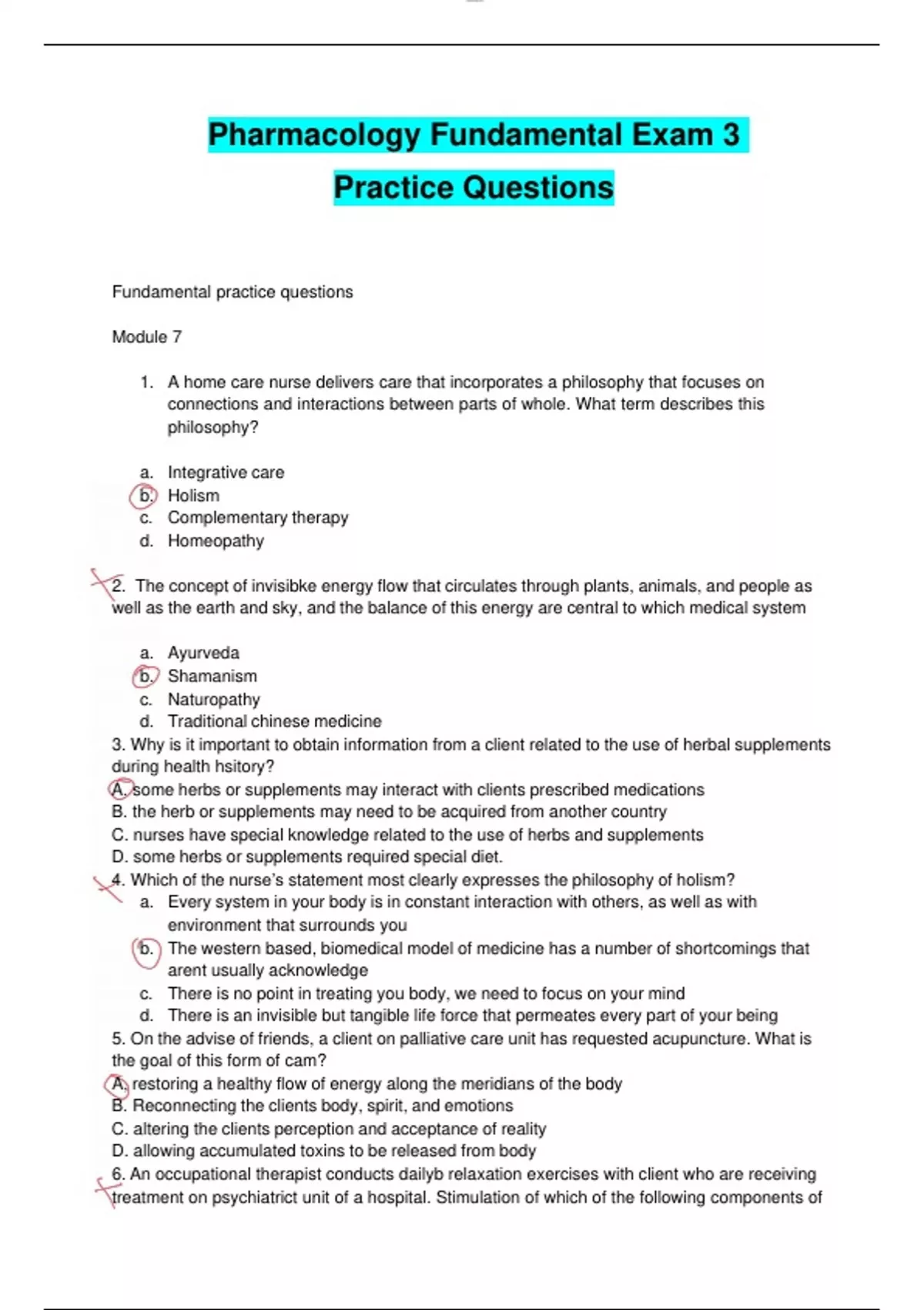 Pharmacology Fundamental Exam 3 Practice Questions This document has questions on modules 7, 8 and 9 Answers with rationale are given at the end of the questions