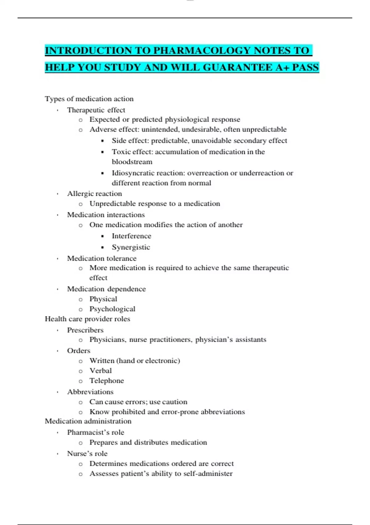 INTRODUCTION TO PHARMACOLOGY NOTES TO HELP YOU STUDY AND WILL GUARANTEE A+ PASS These are lecture notes captured on the important point to note and dont worry if you missed out on your classes as this will come in handy!