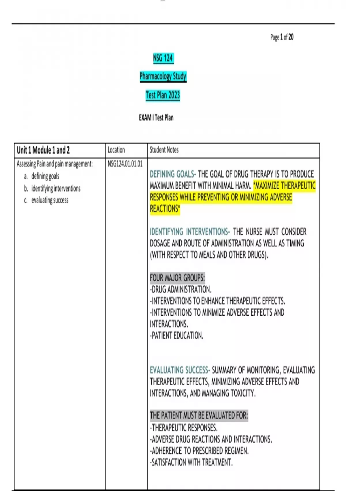 Summary NSG 124 Pharmacology Study Test Plan 2023