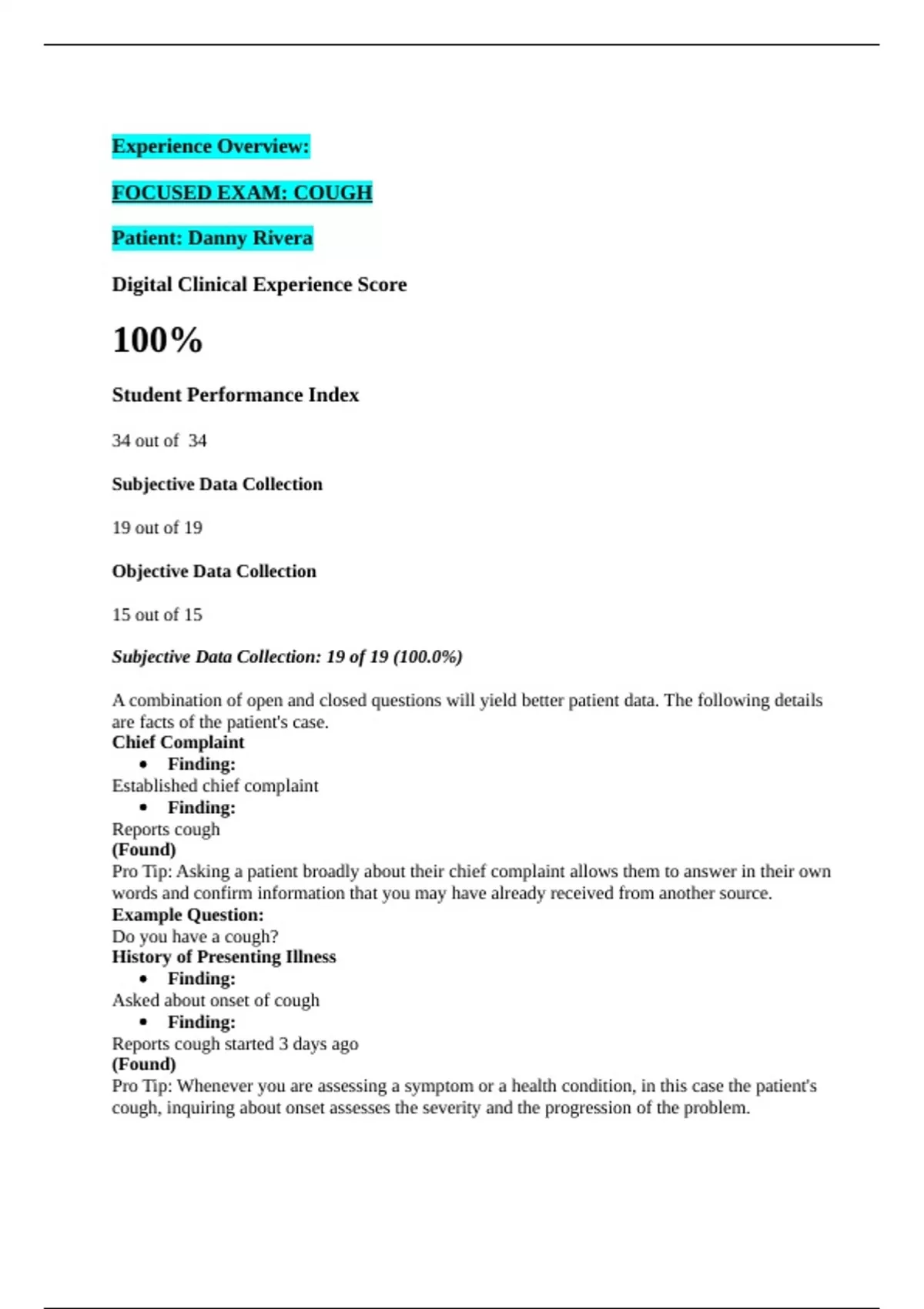Experience Overview:FOCUSED EXAM: COUGHPatient: Danny RiveraDigital Clinical Experience Score100%Student Performance Index34 out of34Subjective Data Collection19 out of 19Objective Data Collection 15 out of 15Subjective Data Collection: 19 of 19 (100.0%)A combination of open and closed questions will yield better patient data. The following detailsare facts of the patient's case.Chief ComplaintFinding:Established chief complaintFinding:Reports cough(Found)Pro Tip: Asking a patient broadly about their chief complaint allows them to answer in their ownwords and confirm information that you may have already received from another source.Example Question:Do you have a cough?History of Presenting IllnessFinding:Asked about onset of coughFinding:Reports cough started 3 days ago(Found)Pro Tip: Whenever you are assessing a symptom or a health condition, in this case the patient'scough, inquiring about onset assesses the severity and the progression of the problem.