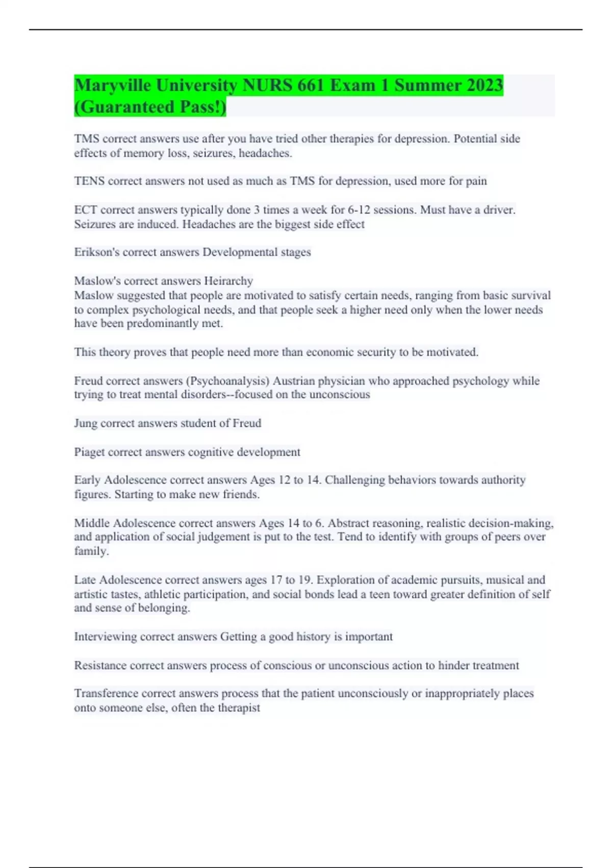 TMS correct answers use after you have tried other therapies for depression. Potential side effects of memory loss, seizures, headaches. TENS correct answers not used as much as TMS for depression, used more for pain ECT correct answers typically done 3 times a week for 6-12 sessions. Must have a driver. Seizures are induced. Headaches are the biggest side effect Erikson's correct answers Developmental stages Maslow's correct answers Heirarchy Maslow suggested that people are motivated to satisfy certain needs, ranging from basic survival to complex psychological needs, and that people seek a higher need only when the lower needs have been predominantly met. This theory proves that people need more than economic security to be motivated. Freud correct answers (Psychoanalysis) Austrian physician who approached psychology while trying to treat mental disorders--focused on the unconscious Jung correct answers student of Freud Piaget correct answers cognitive development Early Adolescence correct answers Ages 12 to 14. Challenging behaviors towards authority figures. Starting to make new friends. Middle Adolescence correct answers Ages 14 to 6. Abstract reasoning, realistic decision-making, and application of social judgement is put to the test. Tend to identify with groups of peers over family. Late Adolescence correct answers ages 17 to 19. Exploration of academic pursuits, musical and artistic tastes, athletic participation, and social bonds lead a teen toward greater definition of self and sense of belonging. Interviewing correct answers Getting a good history is important Resistance correct answers process of conscious or unconscious action to hinder treatment Transference correct answers process that the patient unconsciously or inappropriately places onto someone else, often the therapist
