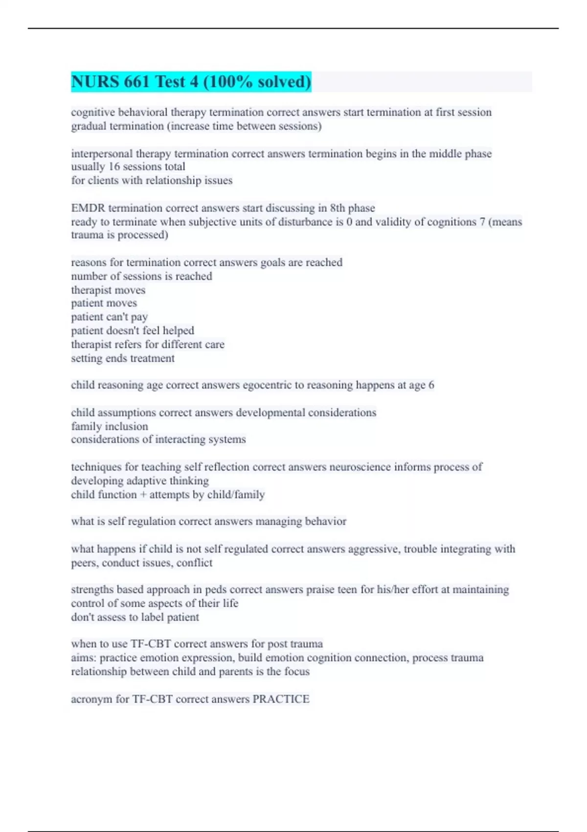cognitive behavioral therapy termination correct answers start termination at first session gradual termination (increase time between sessions) interpersonal therapy termination correct answers termination begins in the middle phase usually 16 sessions total for clients with relationship issues EMDR termination correct answers start discussing in 8th phase ready to terminate when subjective units of disturbance is 0 and validity of cognitions 7 (means trauma is processed) reasons for termination correct answers goals are reached number of sessions is reached therapist moves patient moves patient can't pay patient doesn't feel helped therapist refers for different care setting ends treatment child reasoning age correct answers egocentric to reasoning happens at age 6 child assumptions correct answers developmental considerations family inclusion considerations of interacting systems techniques for teaching self reflection correct answers neuroscience informs process of developing adaptive thinking child function + attempts by child/family what is self regulation correct answers managing behavior what happens if child is not self regulated correct answers aggressive, trouble integrating with peers, conduct issues, conflict strengths based approach in peds correct answers praise teen for his/her effort at maintaining control of some aspects of their life don't assess to label patient when to use TF-CBT correct answers for post trauma aims: practice emotion expression, build emotion cognition connection, process trauma relationship between child and parents is the focus acronym for TF-CBT correct answers PRACTICE