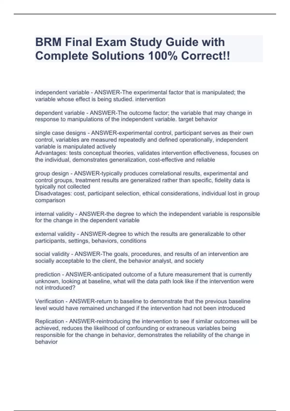 independent variable - ANSWER-The experimental factor that is manipulated; the variable whose effect is being studied. intervention dependent variable - ANSWER-The outcome factor; the variable that may change in response to manipulations of the independent variable. target behavior single case designs - ANSWER-experimental control, participant serves as their own control, variables are measured repeatedly and defined operationally, independent variable is manipulated actively Advantages: tests conceptual theories, validates intervention effectiveness, focuses on the individual, demonstrates generalization, cost-effective and reliable group design - ANSWER-typically produces correlational results, experimental and control groups, treatment results are generalized rather than specific, fidelity data is typically not collected Disadvatages: cost, participant selection, ethical considerations, individual lost in group comparison internal validity - ANSWER-the degree to which the independent variable is responsible for the change in the dependent variable external validity - ANSWER-degree to which the results are generalizable to other participants, settings, behaviors, conditions social validity - ANSWER-The goals, procedures, and results of an intervention are sociall