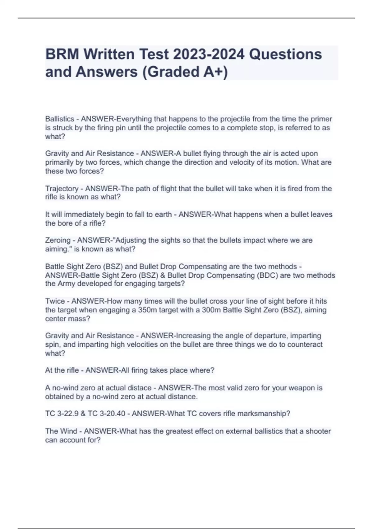 Ballistics - ANSWER-Everything that happens to the projectile from the time the primer is struck by the firing pin until the projectile comes to a complete stop, is referred to as what? Gravity and Air Resistance - ANSWER-A bullet flying through the air is acted upon primarily by two forces, which change the direction and velocity of its motion. What are these two forces? Trajectory - ANSWER-The path of flight that the bullet will take when it is fired from the rifle is known as what? It will immediately begin to fall to earth - ANSWER-What happens when a bullet leaves the bore of a rifle? Zeroing - ANSWER-"Adjusting the sights so that the bullets impact where we are aiming." is known as what? Battle Sight Zero (BSZ) and Bullet Drop Compensating are the two methods - ANSWER-Battle Sight Zero (BSZ) & Bullet Drop Compensating (BDC) are two methods the Army developed for engaging targets? Twice - ANSWER-How many times will the bullet cross your line of sight before it hits the target when engaging a 350m target with a 300m Battle Sight Zero (BSZ), aiming center mass? Gravity and Air Resistance - ANSWER-Increasing the angle of departure, imparting s