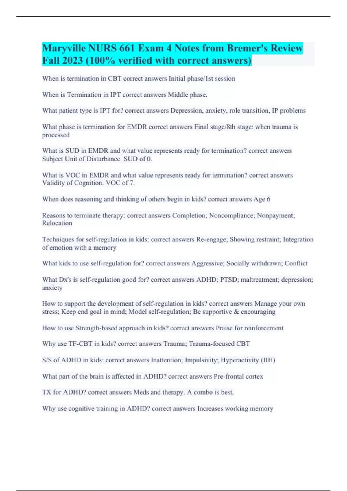 Maryville NURS 661 Exam 4 Notes from Bremer's Review Fall 2023 (100% verified with correct answers)