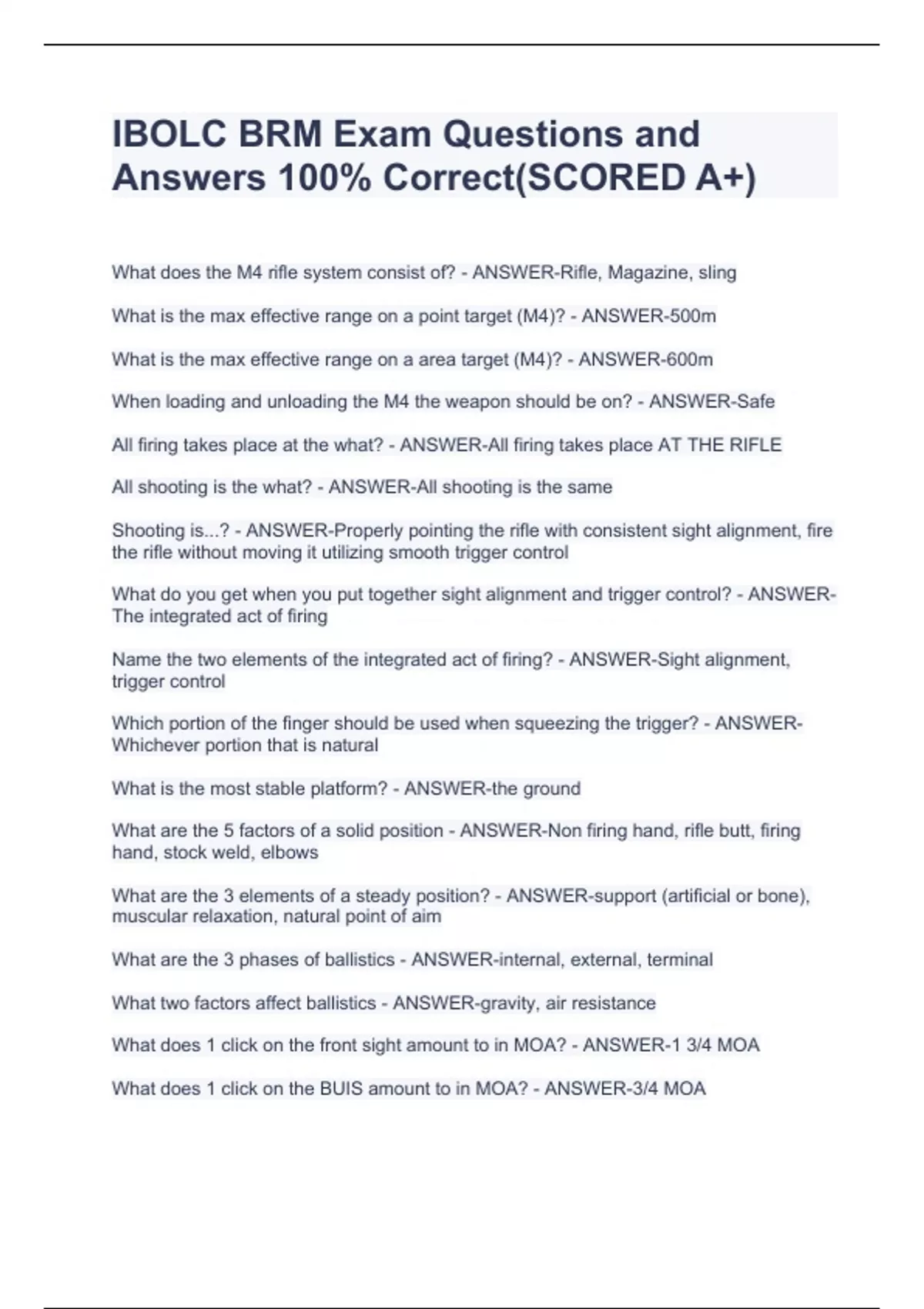 What does the M4 rifle system consist of? - ANSWER-Rifle, Magazine, sling What is the max effective range on a point target (M4)? - ANSWER-500m What is the max effective range on a area target (M4)? - ANSWER-600m When loading and unloading the M4 the weapon should be on? - ANSWER-Safe All firing takes place at the what? - ANSWER-All firing takes place AT THE RIFLE All shooting is the what? - ANSWER-All shooting is the same Shooting is...? - ANSWER-Properly pointing the rifle with consistent sight alignment, fire the rifle without moving it utilizing smooth trigger control What do you get when you put together sight alignment and trigger control? - ANSWER-The integrated act of firing Name the two elements of the integrated act of firing? - ANSWER-Sight alignment, trigger control Which portion of the finger should be used when squeezing the trigger? - ANSWER-Whichever portion that is natural What is the most stable platform? - ANSWER-the ground What are the 5 factors of a solid position - ANSWER-Non firing hand, rifle butt, firing hand, stock weld, elbows