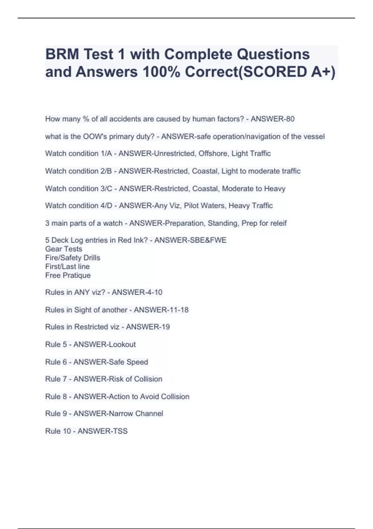 How many % of all accidents are caused by human factors? - ANSWER-80 what is the OOW's primary duty? - ANSWER-safe operation/navigation of the vessel Watch condition 1/A - ANSWER-Unrestricted, Offshore, Light Traffic Watch condition 2/B - ANSWER-Restricted, Coastal, Light to moderate traffic Watch condition 3/C - ANSWER-Restricted, Coastal, Moderate to Heavy Watch condition 4/D - ANSWER-Any Viz, Pilot Waters, Heavy Traffic 3 main parts of a watch - ANSWER-Preparation, Standing, Prep for releif 5 Deck Log entries in Red Ink? - ANSWER-SBE&FWE Gear Tests Fire/Safety Drills First/Last line Free Pratique Rules in ANY viz? - ANSWER-4-10 Rules in Sight of another - ANSWER-11-18 Ru