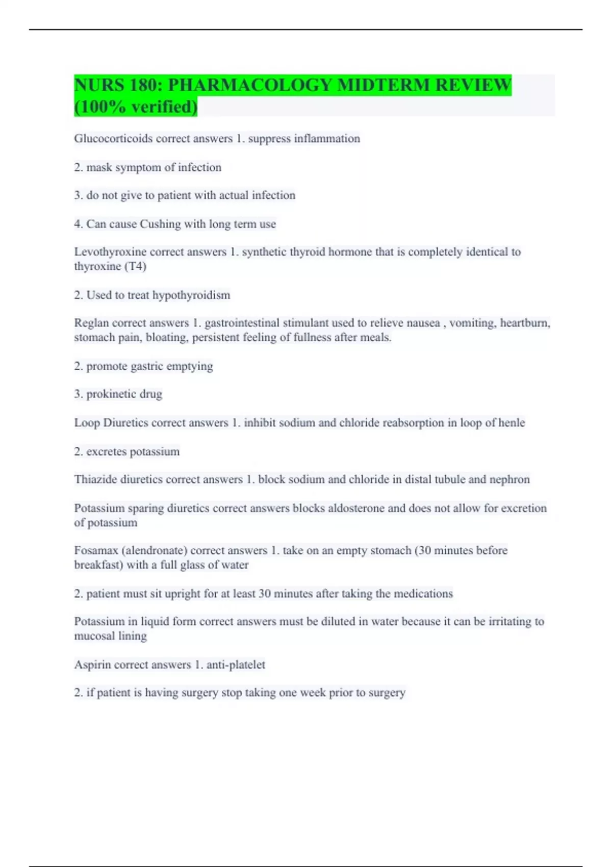 Glucocorticoids correct answers 1. suppress inflammation 2. mask symptom of infection 3. do not give to patient with actual infection 4. Can cause Cushing with long term use Levothyroxine correct answers 1. synthetic thyroid hormone that is completely identical to thyroxine (T4) 2. Used to treat hypothyroidism Reglan correct answers 1. gastrointestinal stimulant used to relieve nausea , vomiting, heartburn, stomach pain, bloating, persistent feeling of fullness after meals. 2. promote gastric emptying 3. prokinetic drug Loop Diuretics correct answers 1. inhibit sodium and chloride reabsorption in loop of henle 2. excretes potassium Thiazide diuretics correct answers 1. block sodium and chloride in distal tubule and nephron Potassium sparing diuretics correct answers blocks aldosterone and does not allow for excretion of potassium Fosamax (alendronate) correct answers 1. take on an empty stomach (30 minutes before breakfast) with a full glass of water 2. patient must sit upright for at least 30 minutes after taking the medications Potassium in liquid form correct answers must be diluted in water because it can be irritating to mucosal lining Aspirin correct answers 1. anti-platelet 2. if patient is having surgery stop taking one week prior to surgery