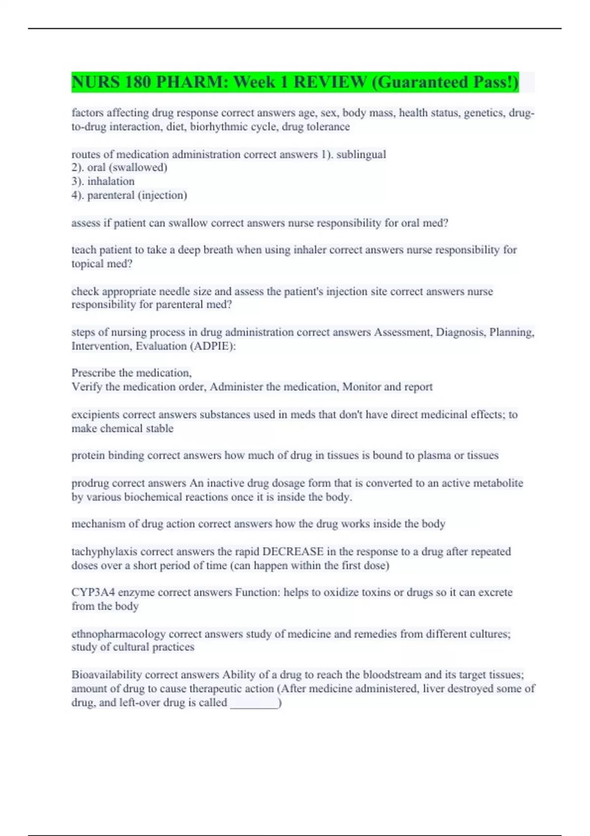 factors affecting drug response correct answers age, sex, body mass, health status, genetics, drug-to-drug interaction, diet, biorhythmic cycle, drug tolerance routes of medication administration correct answers 1). sublingual 2). oral (swallowed) 3). inhalation 4). parenteral (injection) assess if patient can swallow correct answers nurse responsibility for oral med? teach patient to take a deep breath when using inhaler correct answers nurse responsibility for topical med? check appropriate needle size and assess the patient's injection site correct answers nurse responsibility for parenteral med? steps of nursing process in drug administration correct answers Assessment, Diagnosis, Planning, Intervention, Evaluation (ADPIE): Prescribe the medication, Verify the medication order, Administer the medication, Monitor and report excipients correct answers substances used in meds that don't have direct medicinal effects; to make chemical stable protein binding correct answers how much of drug in tissues is bound to plasma or tissues prodrug correct answers An inactive drug dosage form that is converted to an active metabolite by various biochemical reactions once it is inside the body. mechanism of drug action correct answers how the drug works inside the body tachyphylaxis correct answers the rapid DECREASE in the response to a drug after repeated doses over a short period of time (can happen within the first dose) CYP3A4 enzyme correct answers Function: helps to oxidize toxins or drugs so it can excrete from the body ethnopharmacology correct answers study of medicine and remedies from different cultures; study of cultural practices Bioavailability correct answers Ability of a drug to reach the bloodstream and its target tissues; amount of drug to cause therapeutic action (After medicine administered, liver destroyed some of drug, and left-over drug is called ________)