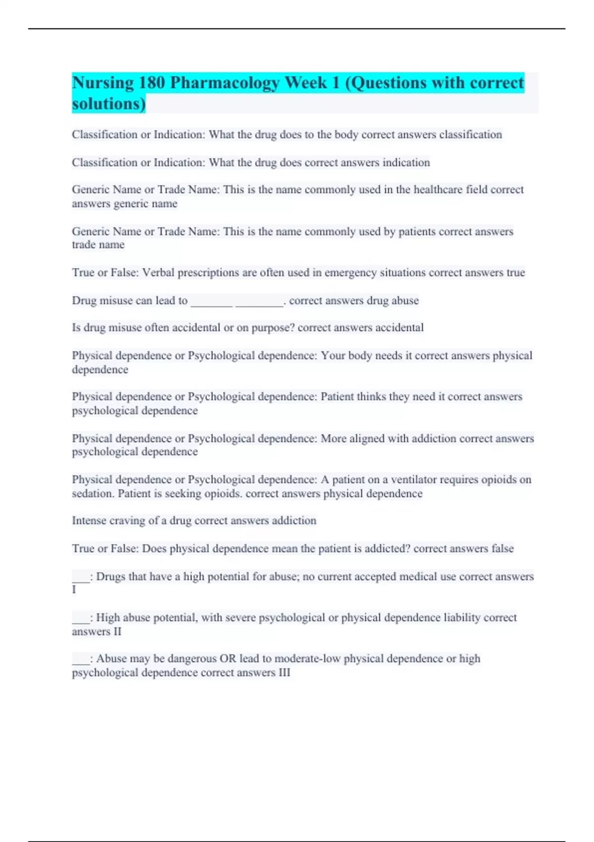 Nursing 180 Pharmacology Week 1 (Questions with correct solutions)